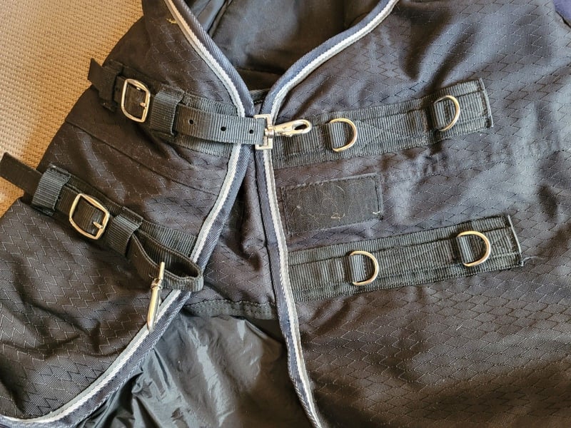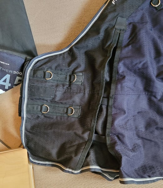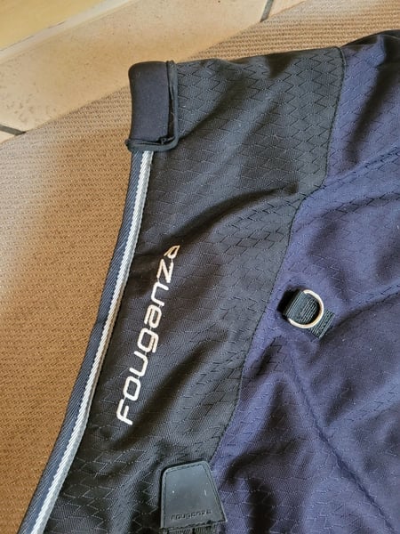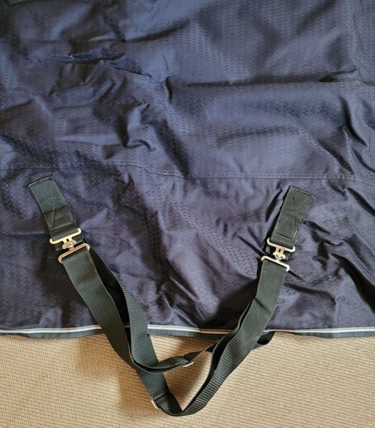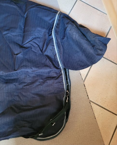 Sie bieten hier auf eine (sie lag 2 Tage auf dem Pferd, richt daher etwas nach Stall, wurde nicht gewaschen wegen der Imprägnierung) blaue tolle Allwetterdecke / Outdoordecke in der Größe 145 cm von der Marke Fouganza / Decathlon Diese Decke ist super durchdacht: Schweiflatz abnehmbare mit Gummi Beingurte am Bauch wird die Decke per Kreuzgurte verschlossen hält super am Pferd - kein Verrutschen mehr vorne Beinfreiheit und mit Gummis fixiert gepolsterter Hals - somit kein Scheuern Harken um Halsteil befestigen Schlaufen zum Decke besser vom Pferd herabholen