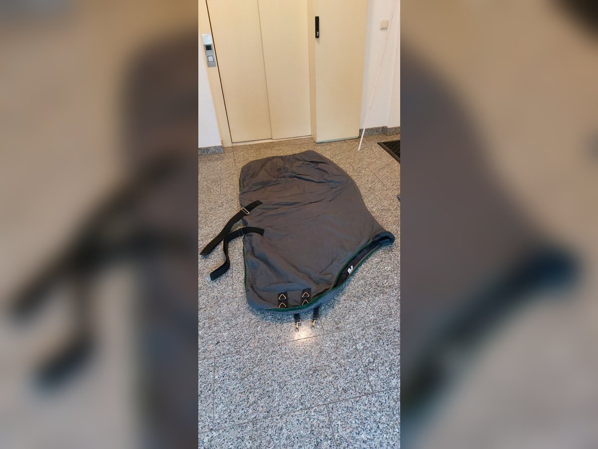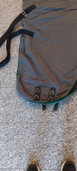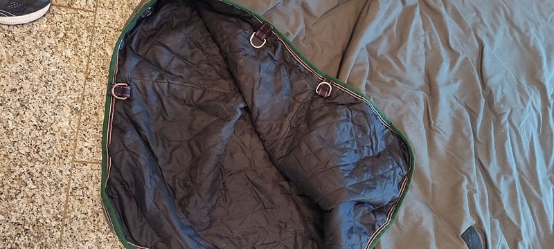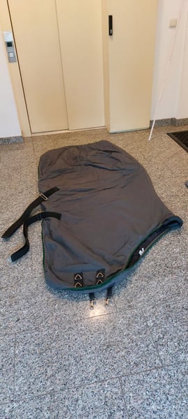 Graugrüne Stalldecke gebraucht, guter Zustand, ich schätze 150g Wattierung, 2 Kreuzgurte, Ösen für Beinschlaufen/ Schweifriemen, 2 Brusthaken, Widerristpolster. Preis zuzgl. Versandkosten. Keine Garantie, keine Rücknahme