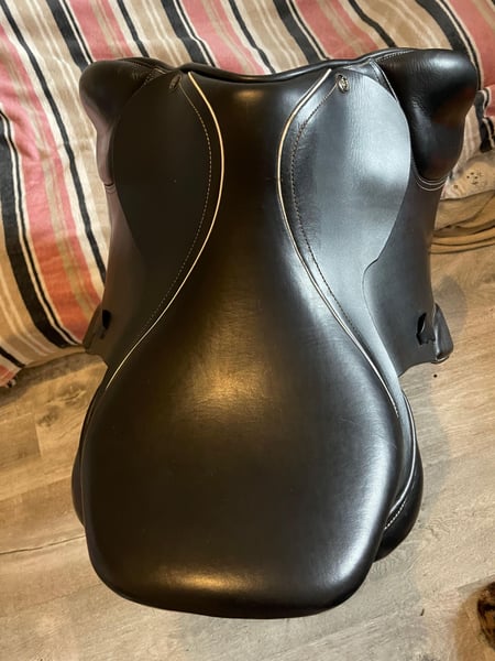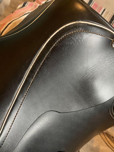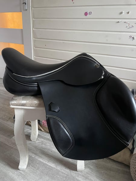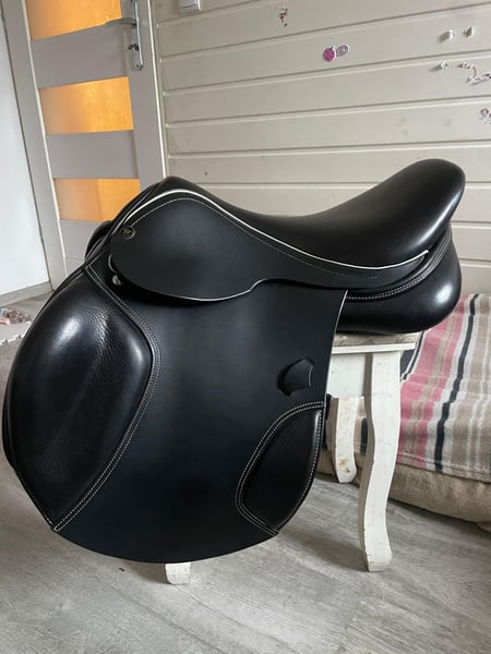 Springsattel „Jantar“ – Exclusive Version – 17,5" Hergestellt von der renommierten polnischen Firma Saimal Galop (seit 1981 auf dem Markt). Gefertigt aus hochwertigem Rindsleder, das regelmäßig gereinigt und mit speziellen Pflegemitteln behandelt wurde und weiterhin elastisch ist. Auf Wunsch wurde rutschfestes Leder an den Kniepauschen sowie auf der Sitzfläche verwendet. Der Sattel wurde stets in einem trockenen und warmen Raum in einer Schutzhülle aufbewahrt. Geringe Gebrauchsspuren vorhanden. Ein kleiner Defekt entstand während des Transports – Abrieb an der rechten Seite des Kopfeisens. Dieser wurde mit Renovierungsmitteln gesichert, um eine weitere Ausbreitung zu verhindern. Weiße Stickerei nach Wunsch. Wollkissenfüllung, Kniepauschen 5 cm. Sattelblätter mit normalen Gebrauchsspuren. Kammerweite: Standard M – 29 cm. Erstbesitz. Keine Anprobe möglich. Bei ernsthaftem Kaufinteresse ist eine angemessene Preisverhandlung möglich. Grüß