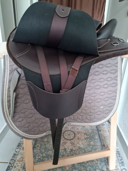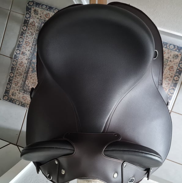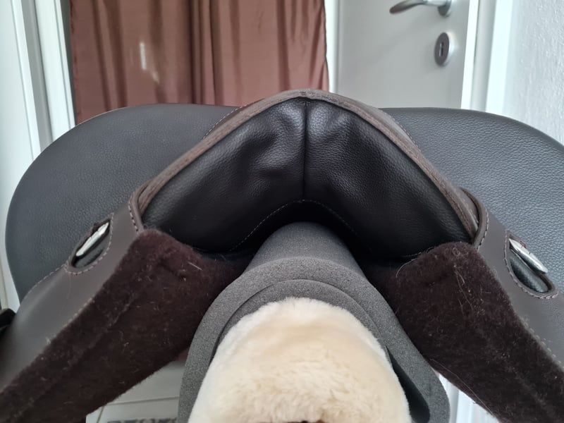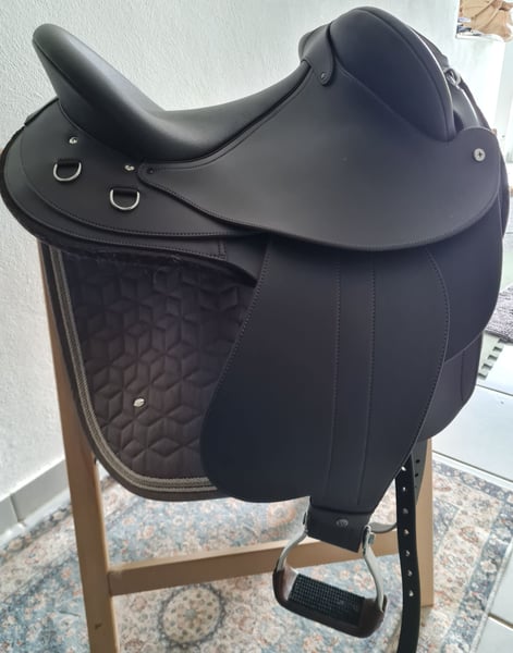Wintec Half Breed Sattel, Hybrid aus Western- und Stocksattel, auch Polo-Cross-Sattel genannt, mega bequem für Reiter und Pferd, individuell anpassbar in Weite und Schwung direkt vor Ort mittels austauschbarem Kopfeisen (von eng bis extra weit) und Einlagen zum entsprechendem Polstern. Man sitzt wunderbar nah am Pferd und daher ist er sowohl für's Gymnastizieren oder Working Equitation geeignet als auch für entspannte Geländeritte, speziell auch für unsichere Reiter, die einen sicheren guten festen Halt im Sattel benötigen. Dieser Sattel wurde direkt aus Australien importiert, ist aktuell noch nicht in Deutschland im Handel erhältlich, wird nur verkauft da er meinem Reitfass leider nicht passt. Sitzgröße M (entspricht 16" Westernsattelsitz bzw 17" Dressursattel), normale Standard Fenderlänge. Passend für schmale bis kräftige Pferde, nicht für überbreite Pferde mit sehr rundem Rücken. Sehr gut für kurze Pferde, der Sattel ist insgesamt nur knapp 58cm lang. Aktuell weißes Kopfeisen verbaut, kann aber nach Bedarf getauscht werden und vor Ort an das Pferd angepasst werden. Keine Beschädigungen, wurde im Februar erworben und lag noch keine 5x auf dem Pferd, praktisch neu. Hervorragende Qualität und Verarbeitung und viel leichter als ein Westernsattel. Anprobe inklusive Anpassung vor Ort natürlich möglich, Preis gerne verhandelbar gegen realistisches Angebot. NP 2100€ VB 1750€