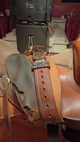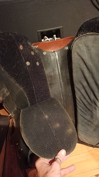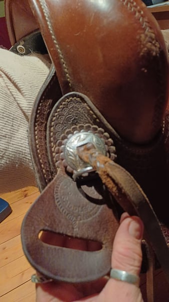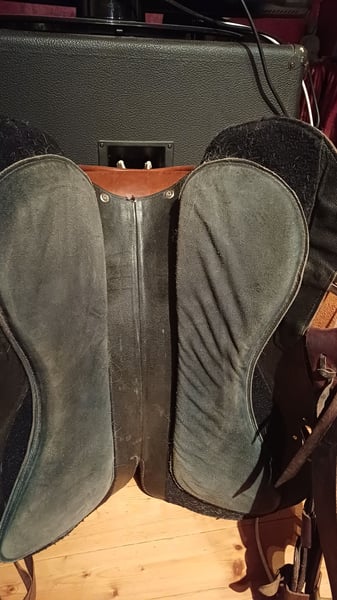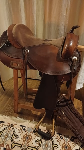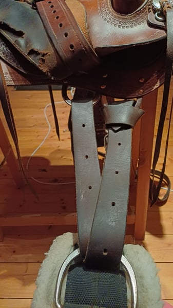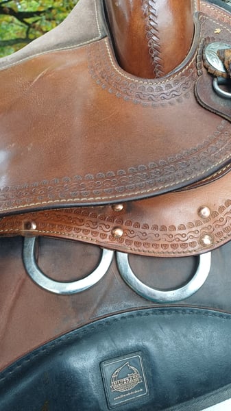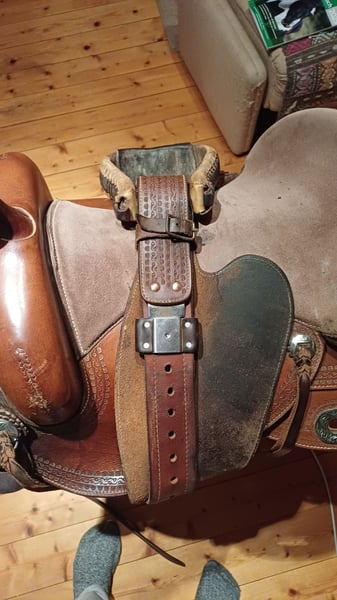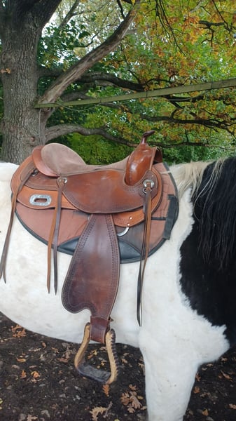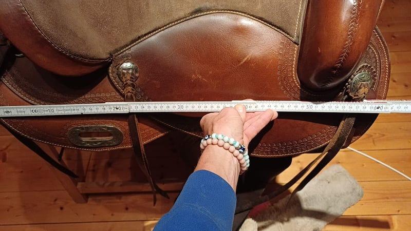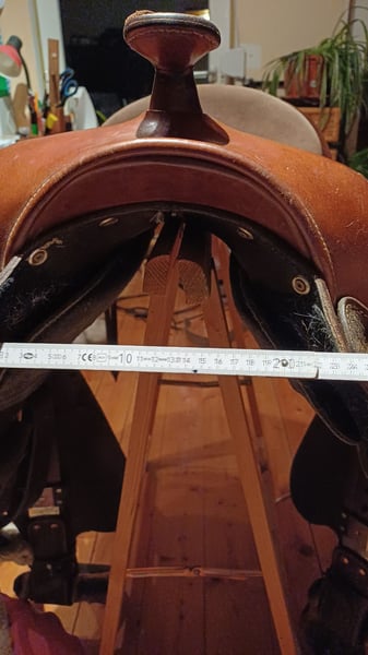 Baumloser Westernsattel der Marke "Silverado". Maße siehe Bilder. Sehr gepflegt, inkl. Gurt. Er ist gut gepflegt und frisch geölt. Besonders positiv hervorzuheben ist die V-Gurtung auf beiden Seiten (2 Ösen zum Befestigen der Tie-Straps). Abnehmbare Klett-Poster sind dabei. Diese können variabel angebracht werden. Bei einem Fender ist die Innenlederseite etwas lädiert (siehe Bild), aber das ist nur ein Schönheitsfehler, man sieht es von außen nicht und beeinträchtigt die Funktion in keiner Weise. Der Sattel passt eher auf kleinere, breitere Pferde. Maße siehe Bilder. Der Sattel ist sehr bequem und passt sich dem Pferderücken durch das NIchtvorhandensein eines Baums an. Er ist mit meiner jungen Stute "mitgewachsen". Leider ist sie nicht mehr reitbar, daher verkaufe ich den Sattel. Er ist sehr bequem und leicht (ca. 10 Kg) und ich würde am liebsten nichts anderes mehr reiten! :-). Inkl. Gurt. NP war 1.100 Euro. Mitnehmen zur Anprobe ist gegen Hinterlegung des Kaufpreises möglich. Bei Nicht-Passen nehme ich ihn zurück. Versand ist möglich gegen Übernahme der Versandkosten. Eine größere oder kleinere Austauschfork ist bei der Firma Silverado bestellbar.