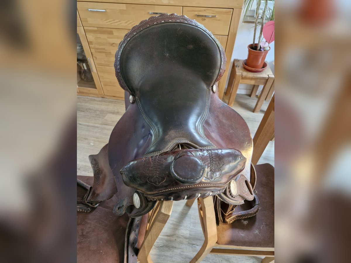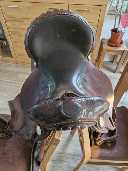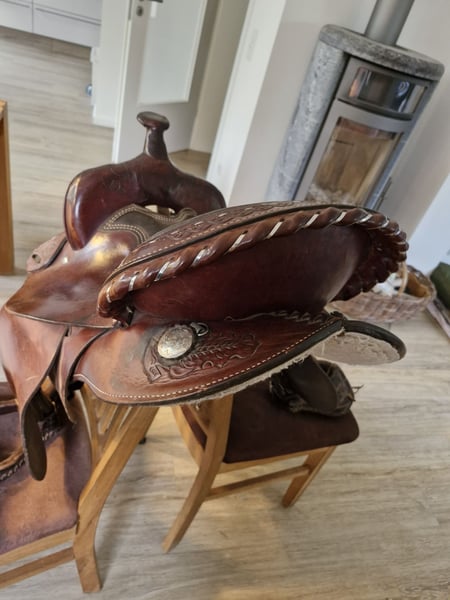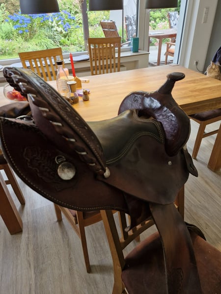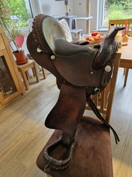 Schöner Westernsattel in sehr gutem gebrauchten Zustand. Marke Continental. Lag auf einem Vollblut. Die dazugehörige Trense mit Zügeln (komplett 50 €) sowie den Professional Choice Lammfell Sattelgurt (80 €)hab ich auch noch dazu passend abzugeben. Alles zusammen würde ich für 500 € abgeben. Standort Bochum 44803. Ausprobieren ist gegen Hinterlegung des Kaufpreises für 1 Woche möglich.