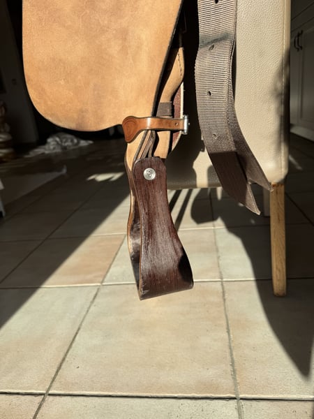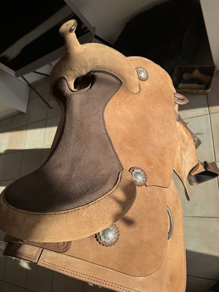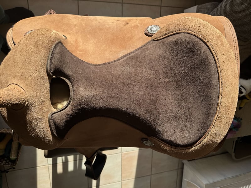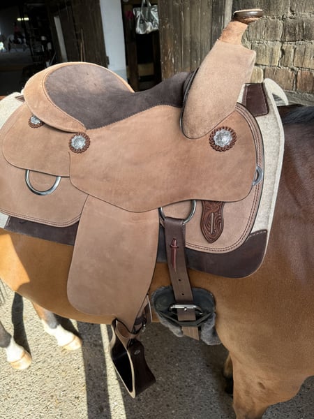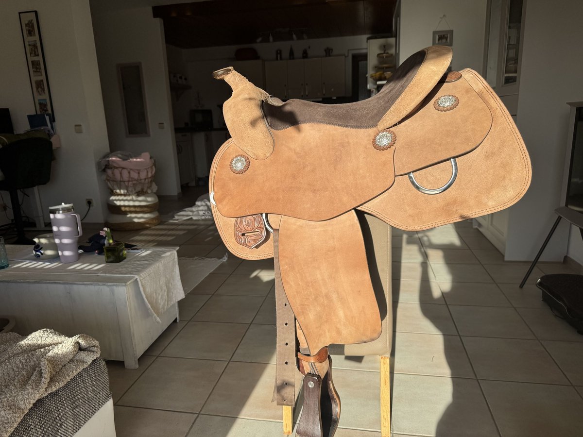 Verkaufe meinen neuwertigen Westernsattel von CR in QH 16 II A, es ist ein CR-Definition Roughout, in Braun mit Edelstahl Conchos, Sitzfläche 16- er Sitz, 38 cm lang, Gesamtlänge Sattel 70 cm,Lederfabrik auf Sitz in dunkelbraun, Steigbügel in Mike Braun Echtholz. Zustand ist sehr gut, da immer mit Sattelschoner geritten. Passt eigentlich auf fast jeden Quarter oder paint . Mit großer Schulterfreiheit. Kleine Kratzer an den Steigbügeln, siehe Fotos Kaufdatum : 29.5.2024 Neupreis : 4760€