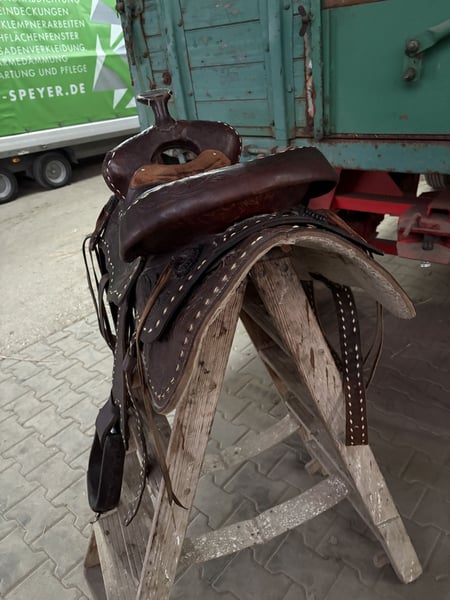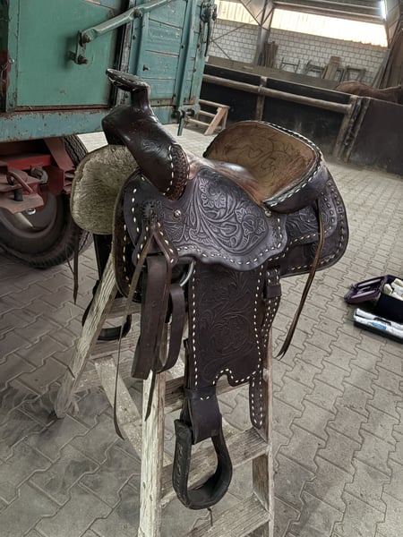 Ich verkaufe meinen gepflegten Westernsattel, ideal für Freizeit und Training. Der Sattel wurde regelmäßig gereinigt, trocken gelagert und ist in gutem Zustand – keine Schäden, nur normale Gebrauchsspuren. Im Paket enthalten: • 3 passende Pads (sauber, gut erhalten, direkt nutzbar) Der Sattel liegt angenehm und bietet einen sicheren, bequemen Sitz. Gewicht: ca 8-10kg Maße siehe Bilder Der Sattel ist zu schade um einfach nur herum zu liegen, da er auf meine Maus leider nie passen wird. Er ist voll funktionsfähig und auch sehr bequem. Er lag schon auf einer Barock-Pinto Friesenmix Stute und einem Tinker. Steigbügel sind auch mit dabei. Er ist also direkt einsatzbereit. Schickt mir gerne realistische Preisvorstellungen, man wird sich sicherlich einig. :) Nur Abholung Bei Interesse oder Fragen gerne melden – Probeanlegen nach Absprache möglich!