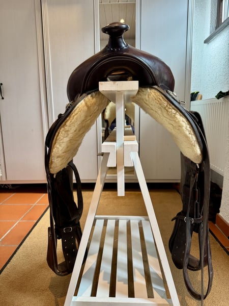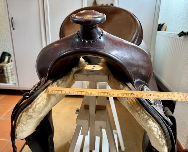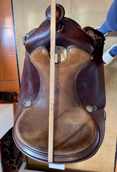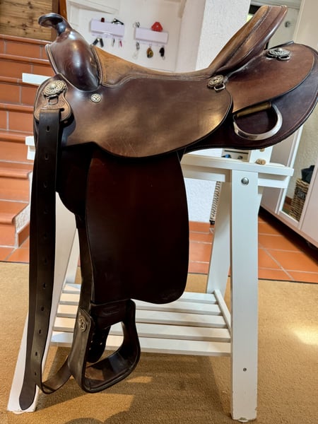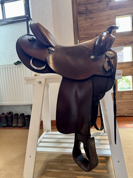 Ich verkaufe meinen Rieser Westernsattel mit Horn Maße siehe Fotos, schoko-braun, Silber-Conchas, hochwertiges Leder, wurde von 2007-2017 (nicht extensiv) genutzt, von da an nur noch sporadisch, wenig Gebrauchsspuren, hauptsächlich an Steigbügeln, 16,5er Sitz, sehr bequem. Er lag auf einer breitschultrigen Quarterstute. Diverse D-Ringe zur sicheren Befestigung des Gepäcks. Durch das Equiscan Messsystem kann der Sattel von Rieser oder einem Fachbetrieb problemlos bis zu einem gewissen Maß angepasst werden. 2021 wurde er von der Sattlerei Rieser für ein neues Pferd - ebenfalls breitschultrige Stute - leicht angepasst und überarbeitet, kam aber nicht mehr zum Einsatz. Der Sattel ist in einem sehr guten Zustand. Er wurde gut gepflegt und im Haus gelagert. Versand ist gegen Übernahme der Kosten möglich, Selbstabholer werden aber bevorzugt. Da es sich um einen Privatkauf handelt, wird keinerlei Garantie, Gewährleistung, Rücknahme, Haftung, Umtausch oder Ähnliches gewährt. Der Sattel kann sehr gerne besichtigt werden.