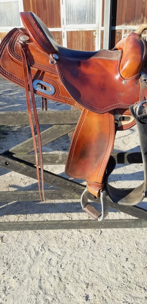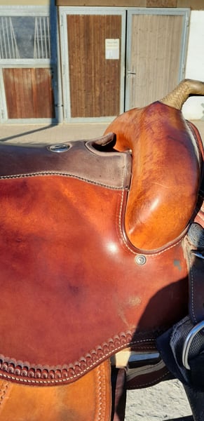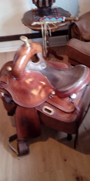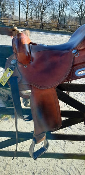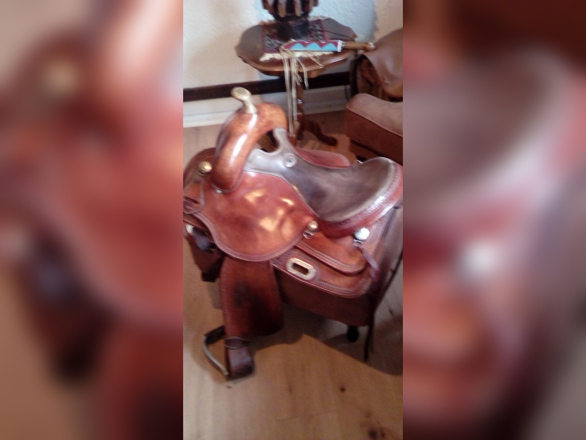 Gut erhaltener Westernsattel aus dem Nachlass meiner Frau. Seit zwei Jahren ungenutzt und trocken gelagert. Der Sattel ist von Deuber und Partner gebaut und von California Brand Saddlery gebranded. Er hat eine XFQuarter Baum und einen weichen bequemen 16" Sitz. Er lag auf einer stabilen Tinka Stute und ist da Er sehr weit aufmacht für stabile Pferde geeignet, siehe Fotos. Er hat eine Dreipunkt Rigging die Ihn nah ans Pferd bringt. Er lässt dem Pferd relativ viel Schulterfreiheit und macht sehr weit auf. Den Reiter setzt Er an die richtige Position ohne Ihn einzuengen. Kontakt Bitte Nur über Telefon 01636130348 da ich selten am PC bin!!!