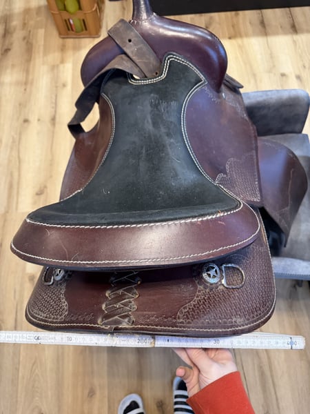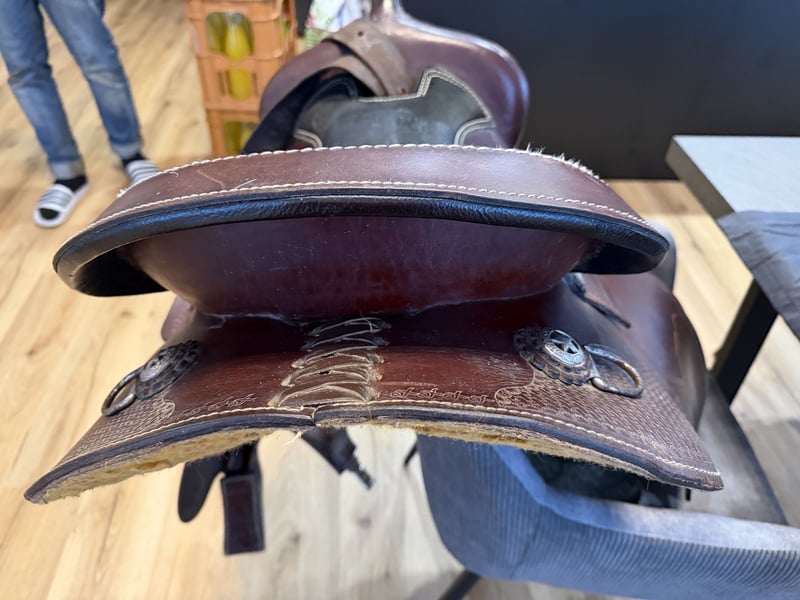 Biete gebrauchten Westernsattel mit Pad an. Lag auf einem Welsh Pony mit einer Höhe von ca 1,20m. Maße siehe Bilder. Ansich in guten Zustand bis auf 3,4 Macken (siehe Bilder) Kein Versand, nur Abholung in 66117 Saarbrücken - Da es sich im einen Privatverkauf handelt, entfällt jegliche Garantie, Gewährleistung oder Rücknahme-