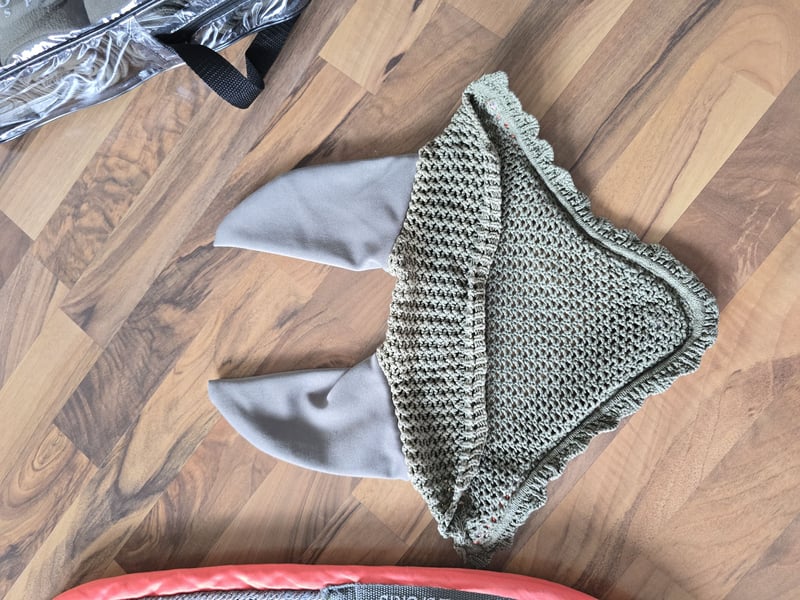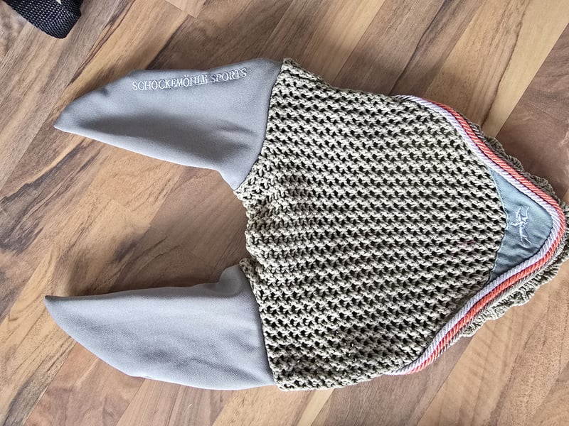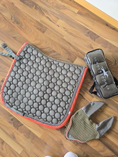 Dressurschabracke + Bandagen +Fliegenohren allesin olive, mit orangenen Akzenten und Schockemöhle Logo (metallemblem Pferd)