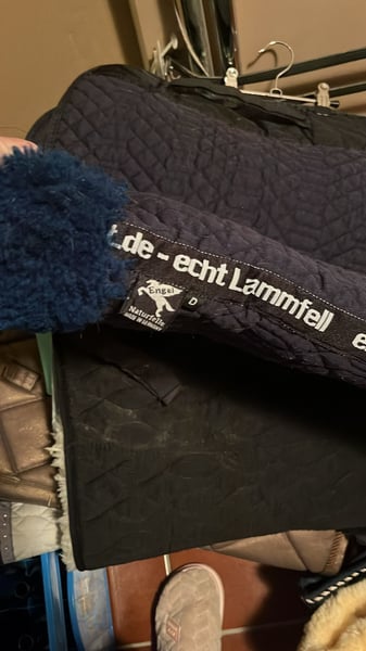 Fellschabracke in dunkelblau mit dunkelblauem Lammfell. Wenig gebraucht. Wie neu. Größe Dressur Schwarz von HKM auch mit echtem Lammfell . Größe VS