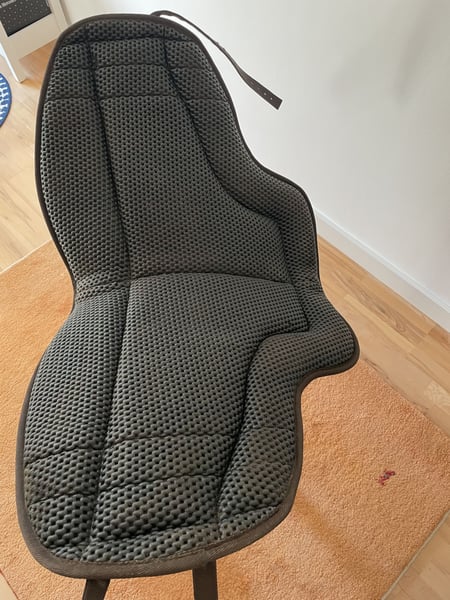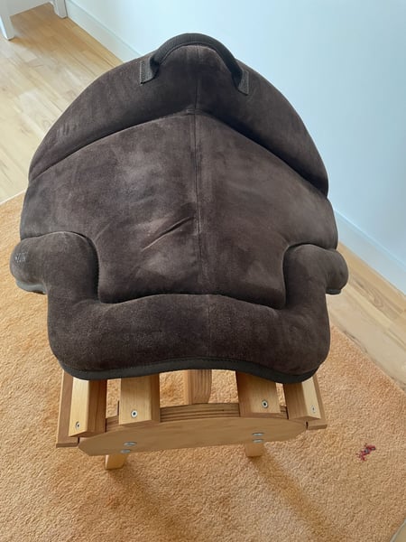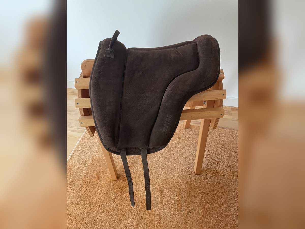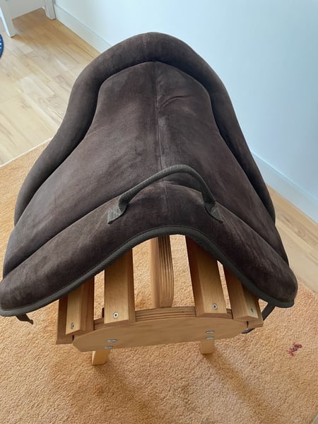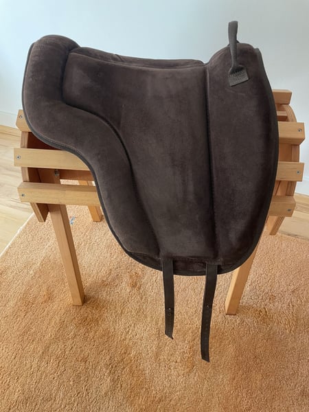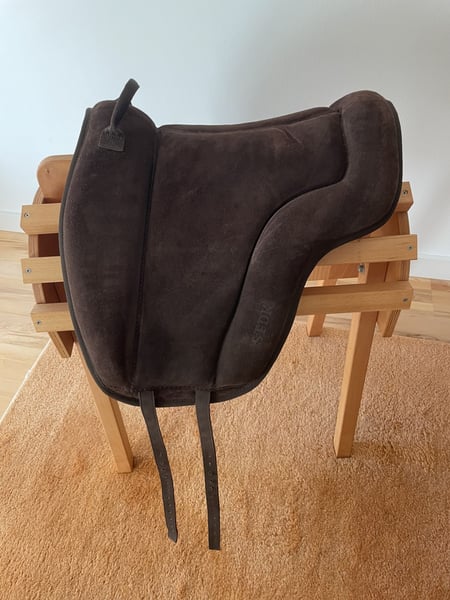 Anatomisch geformtes Reitpad mit Haltegriff und brauner Wildledersitzfläche. Noppen auf der Unterseite vermeiden das Verrutschen während des Reitens. Bequemer Sitz durch dicke Schaumstoffpolsterung. Mit Kurzgurt zu verwenden. Größe F (Warmblut) Anschaffung 09/23, Neupreis € 189, lag nicht oft auf dem Pferd, sehr guter Zustand, keine Beschädigungen