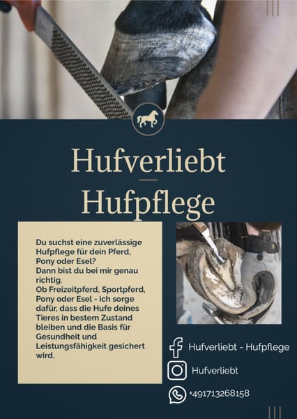 Du suchst eine zuverlässige Hufpflege für dein Pferd, Pony oder Esel? Ob Freizeitpartner oder Sportler – ich sorge dafür, dass die Hufe deines Tieres gesund, leistungsfähig und in Balance bleiben. ✅ Fachgerechte Bearbeitung ✅ Individuelle Betreuung ✅ Mobile Termine direkt am Stall 📍 Raum Haselünne und Umgebung 📲 Kontakt über WhatsApp: +49 171 3268158 📸 Folge „Hufverliebt“ auf Instagram & Facebook