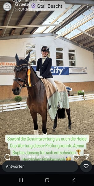 Hallo Wir sind auf der Suche nach einem Dressurpferd zur Verfügung,ein umstallen des Pferdes sollte möglich sein.späterer Kauf nicht ausgeschlossen. Wir sind für alles aufgeschlossen und scheuen keine Kosten und Mühen wenn alles passt . Nun zur meiner Tochter Hallo ich heiße Aenna Sophie Jansing und bin auf der Suche nach einem Dressurpferd/Pony zur Verfügung. Ich bin bis vor kurzem noch im Springsport bis zur Klasse L aktiv gewesen, allerdings hatte ich nun mehrere Stürze die mich abhalten im springen weiter zu machen. In der Dressur bin ich bis vor 2 Jahren mit meinem selbst ausgebildeten Pony bis zur Klasse M** gestartet. In meinem Pony alter waren ich und mein Pony unter anderem für Preis der Besten 2 Mal nominiert. Nun habe ich gemerkt das mein Herz für die Dressur einfach mehr schlägt, weshalb ich nun auf der Suche nach einem passenden Partner bin mit dem ich wieder Spaß in der Dressur habe. Ich komme aus 29525 Uelzen. Bei Fragen gerne melden .