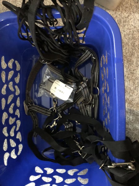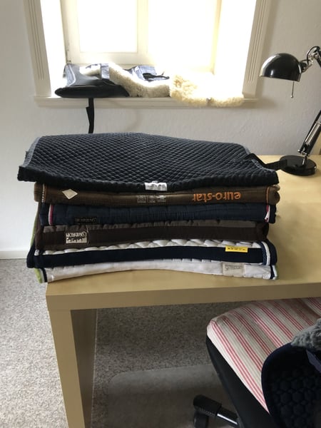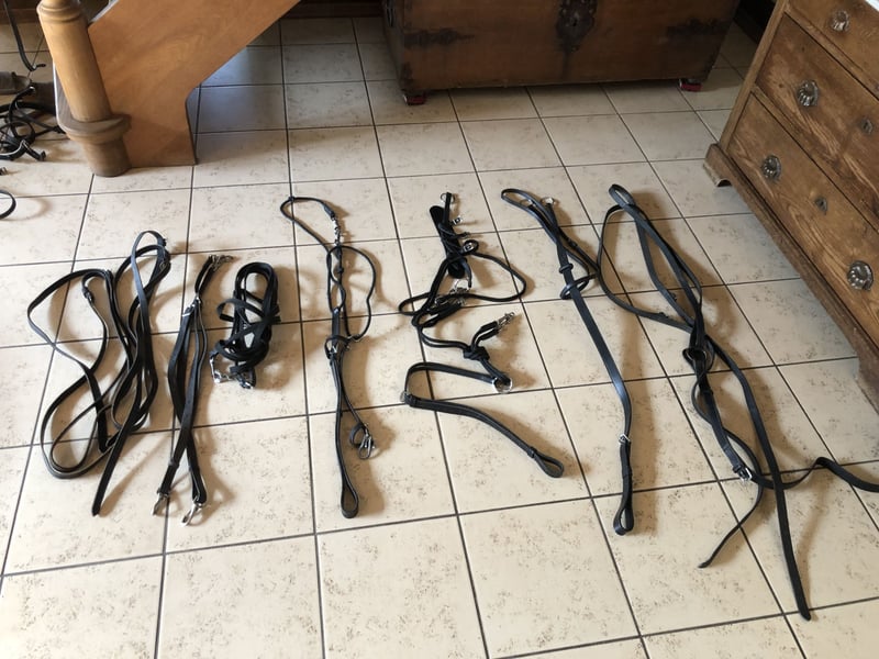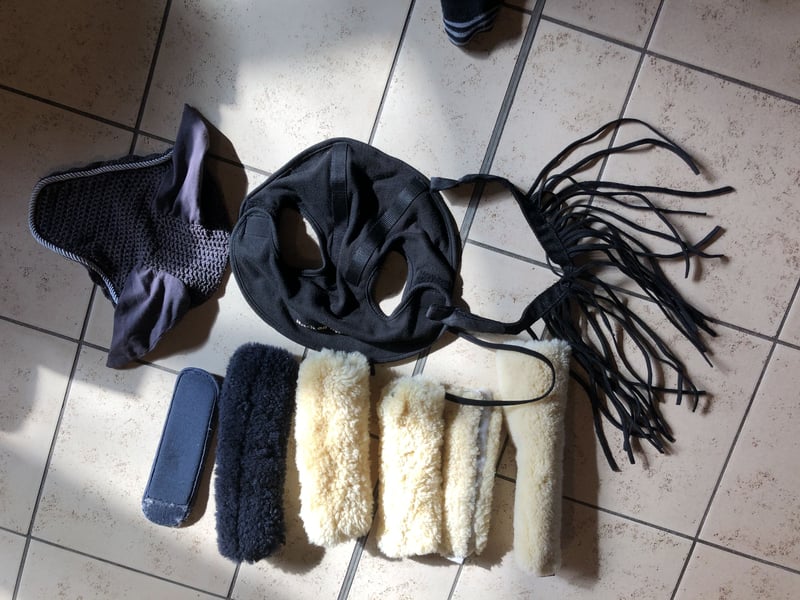 Satteldecken(Mattes mit Fell, Pikeur, u.a.), Pads, Gurte und -schoner, Pferdedecken (Amigo, bucas), Longiergurt und -Unterlage, verschiedene Hilfszügel, Trensen, verschiedene, auch ein Stotzem Zaum für verschiedene Kopfgrößen, Gebisse, Kleinkram….in sehr gutem Zustand, Größe Warmblut!!!! Nur alles zusammen!!!!Abholung