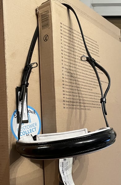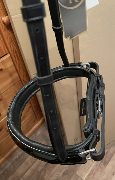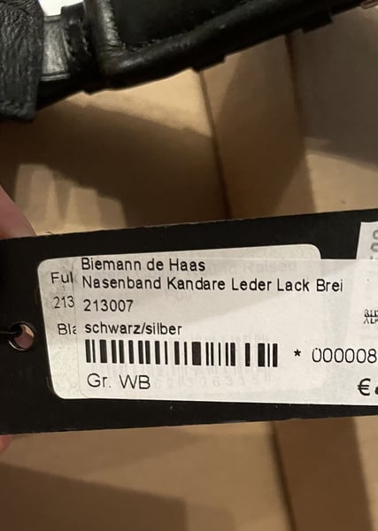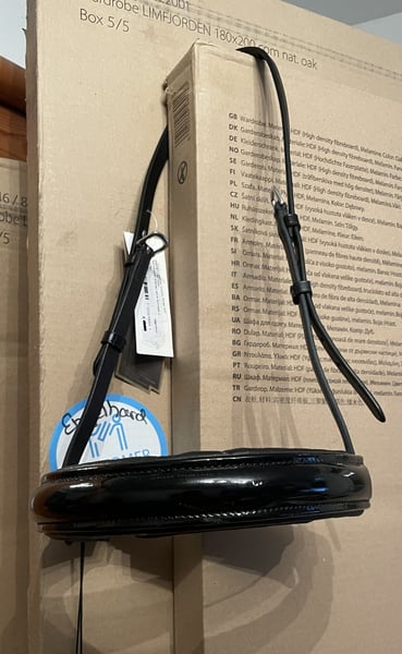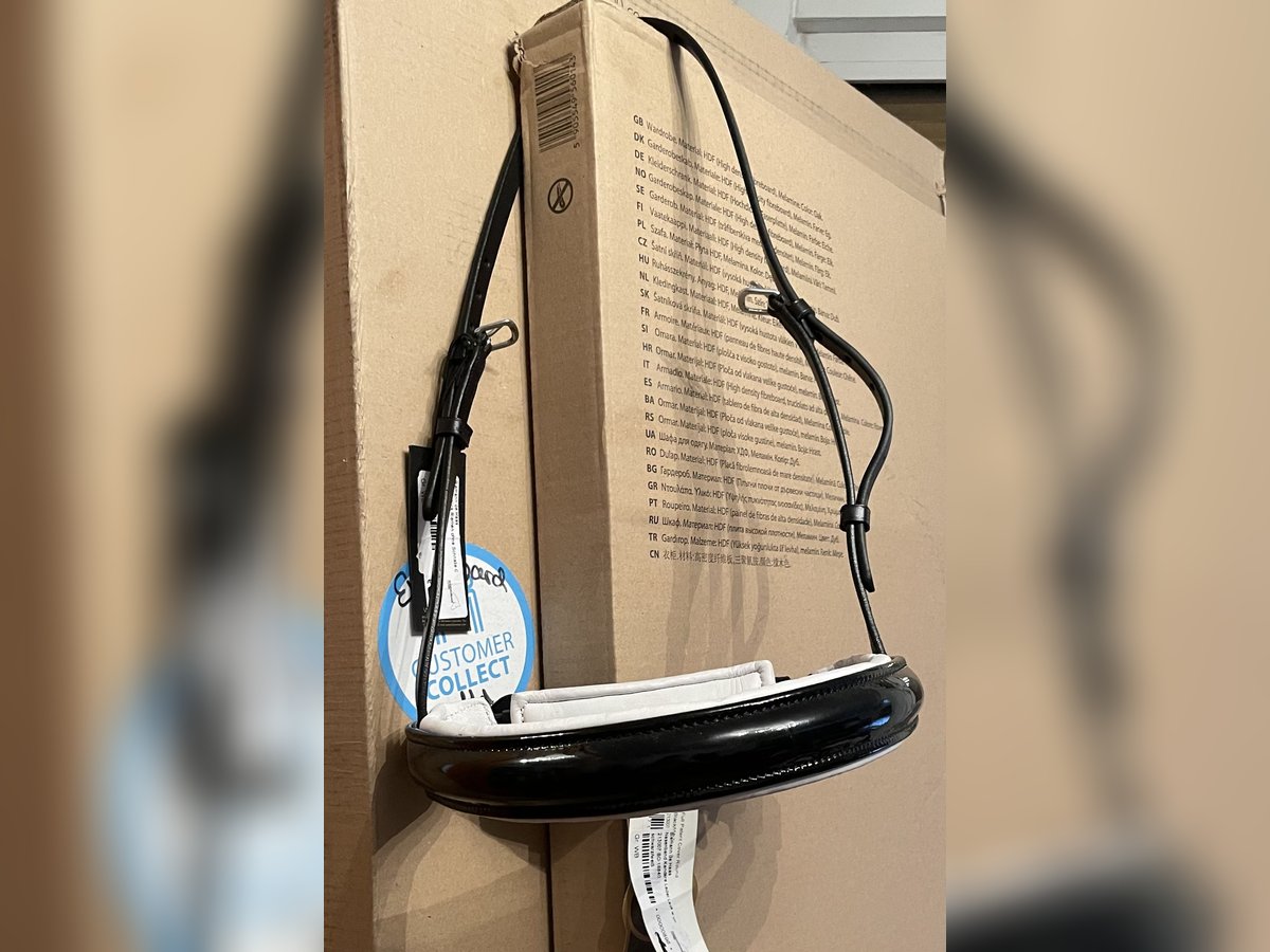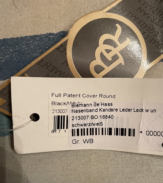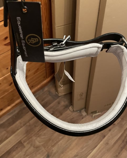 BR Reithalfter für Kandarre Lack weiß und schwarz unterlegt.