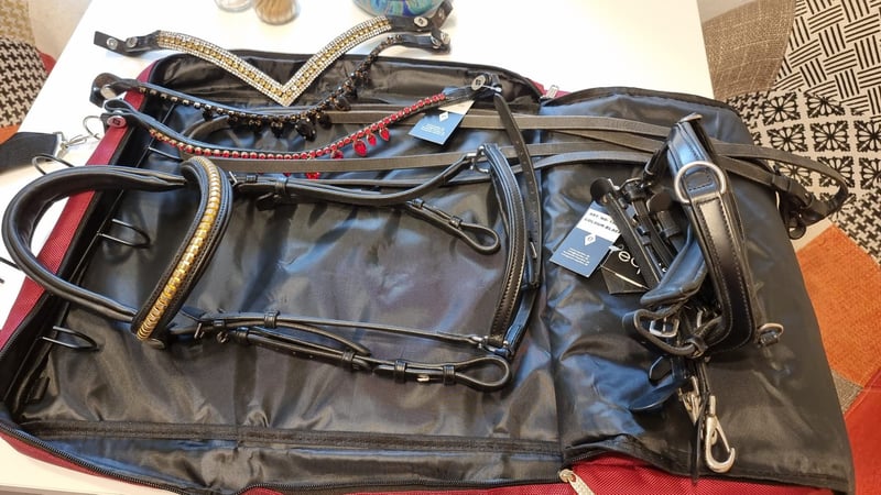 Beschreibung Von der dänischen Nobelmarke Equitec: Kopfstück, 2 Nasenriemen, Schnellwechselgebisshalter, 4 Stirnriemen Equitec NP 523,60 Comfort Lux anatomisk Næsebånd Comfort Lux Flex super soft nakkestykke Comfort Lux German næsebånd Golden Champ Pandebånd Red Diamond Drops Pandebånd Black Diamond Drops Pandebånd Golden Muse Comfort Lux Side straps quick chance Bit Alles komplett neu + Stübben schmale Lederzügel, NP 129,- etwa 3 x verwendet + rote Zaumzeugtasche neu 39,- ALLES ZUSAMMEN ORIGINALKAUFPREIS: 691,60 Größe Isländer, Cob, Vollblut, kleines Warmblut