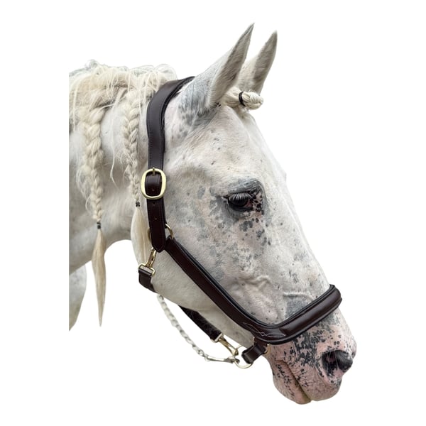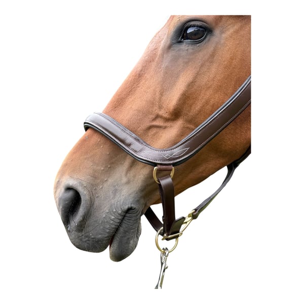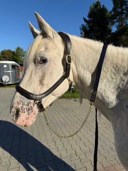 Lederhalfter Luxus Anatomisch Runde Ecken am Jochbein, viel Ohrenfreiheit und extra dickes Polster am empfindlichen Schleimbeutel im Genick Kein Pferd sollte ein Halfter tragen welches an den Jochbeinen scheuert und an den Ohren reibt oder auf den empfindlichen Schleimbeutel im Genick drückt.. Jetzt haben wir eine 2x Anatomisch geformtes Halfter entwickelt, welches weich gepolstert ist und garantiert nicht scheuer. Schick und bequem, das hat sich ihr Pferd verdient. Im Kombiset mit Führkette Polyester- Gurtband 125 € ohne Führkette 109 €