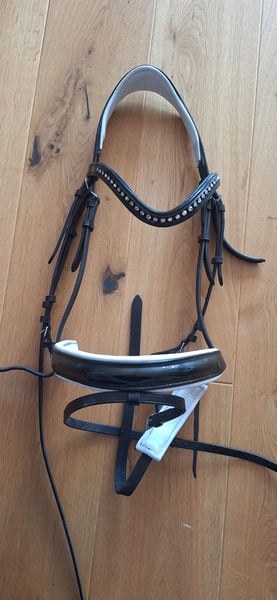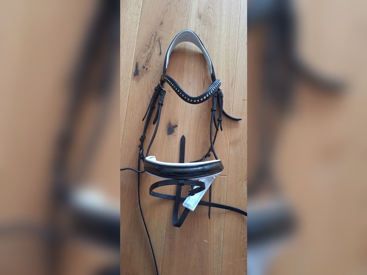 Verkaufe selten genutzte Trense, größe WB, Lack Nasenriemen mit weißem Leder unterlegt. Stirmriemen gebe ich dazu, Zügel sind keine dabei Es liegen keine Mängel vor, komplett funktionsfähig. Versand bei Übernahme der Kosten möglich. Privatverkauf, keine Rücknahme oder Garantie.