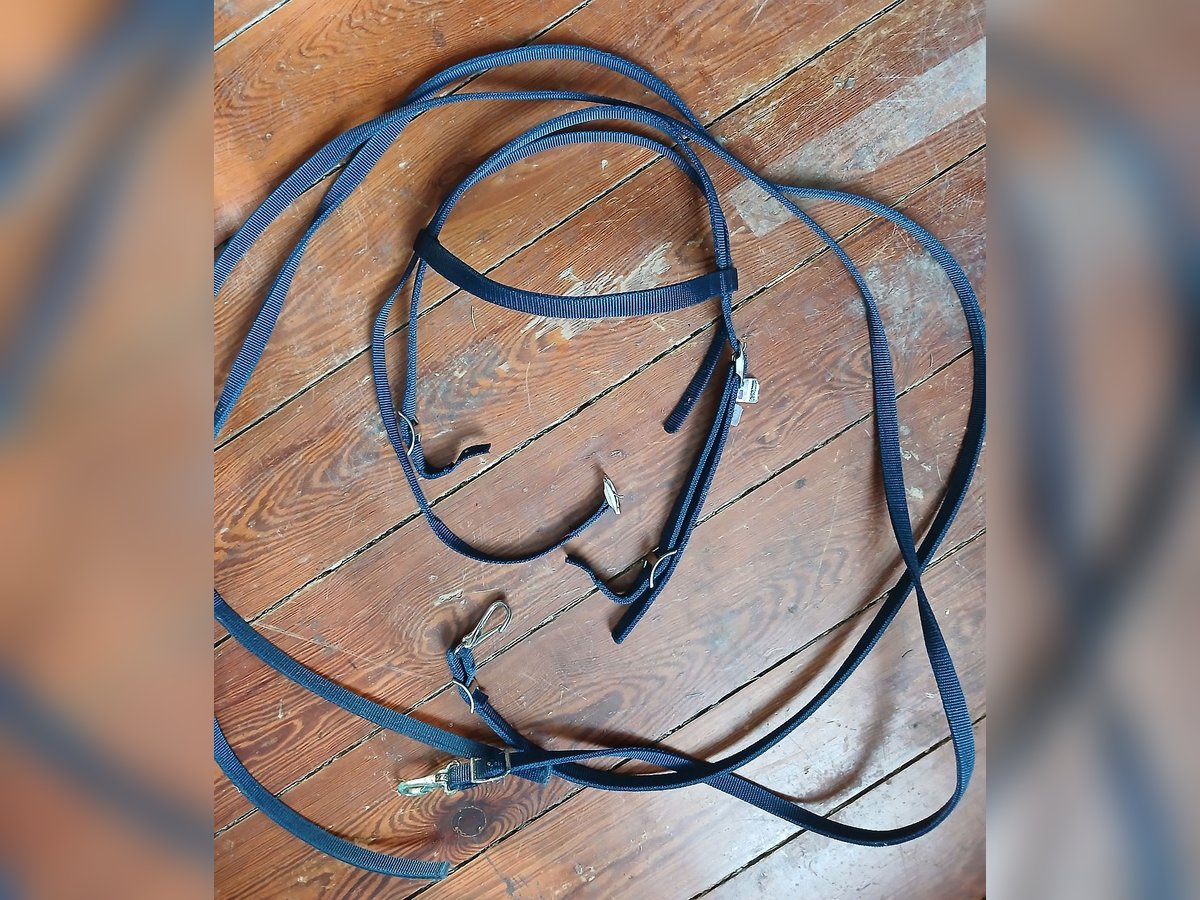 Leichtes Western-Zaumzeug mit Zügeln aus stabilem, dunkelblauen Gurtgewebe. Größe Full