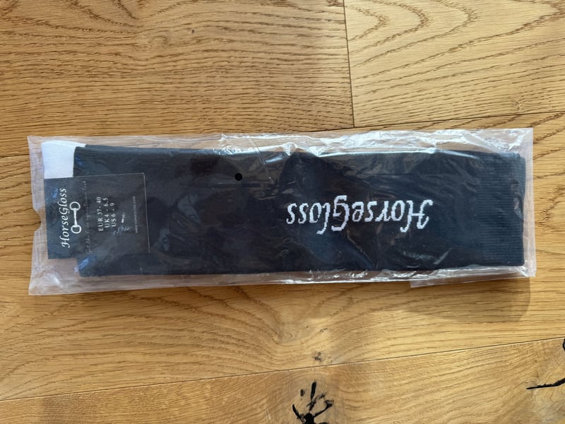 Neue & verpackte Reitsocken von der Marke HorseGloss in der Größe 37-40 und Farbe Schwarz. Unten an den Füßen mit einem Schriftzug (linker Socken Coffee, rechter Socken First) Meines Wissens inzwischen ausverkauft Privatverkauf, daher keine Garantie, Gewährleistung oder Rücknahme