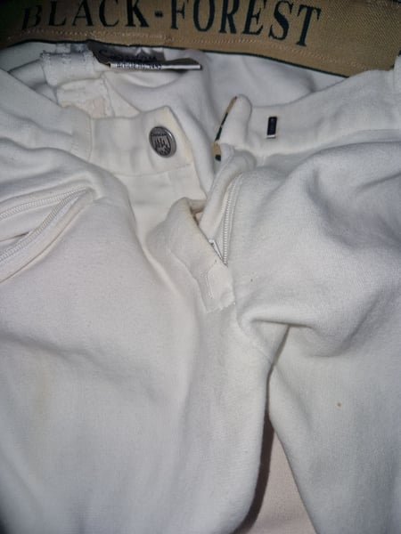 Größe 36/38. Loesdau Reihose ohne gummierten Vollbesatz oder gummierten Kniebesatz. Der Besatz geht vom Hosenbund bis über die Knie. Es gibt eine kleine Tasche auf der rechten Vorderseite mit silberfarbenen Reißverschluss. Klettverschluss an beiden Hosenenden zum verengern des Beinabschlusses. Stretchhose. Diese Hose wurde noch nie beim Reiten getragen. Der Zustand ist ungebraucht und daher neu.