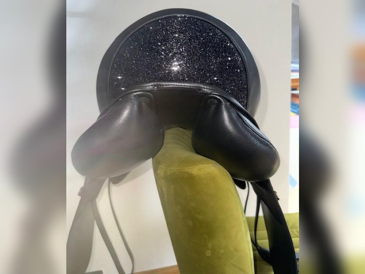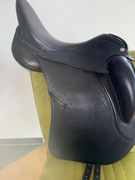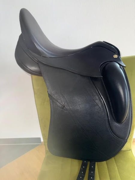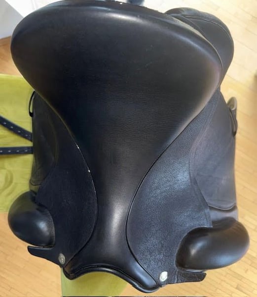 Neuer Sommer Dressursattel 17" 4x damit geritten Kaufdatum: 03.02.2026 schwarz Büffelleder Keder Lackschwarz Halbmond Glitzer sehr weichem Monoblatt angesetzte Pausche Tiefer Sitz 3990,-- Reiter und Pferd kommen leider nicht mit diesem Schmuckstück zurecht! Privatverkauf