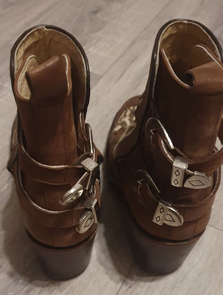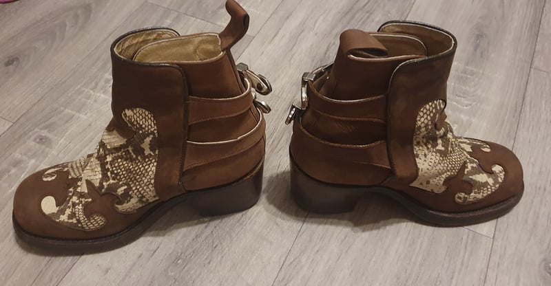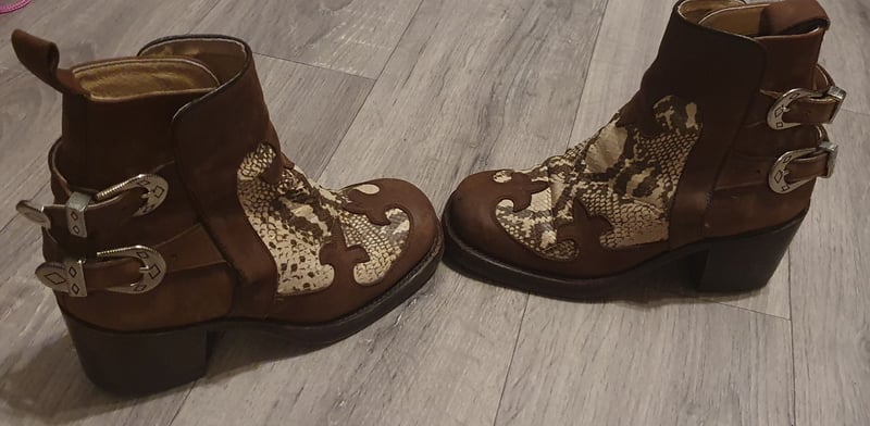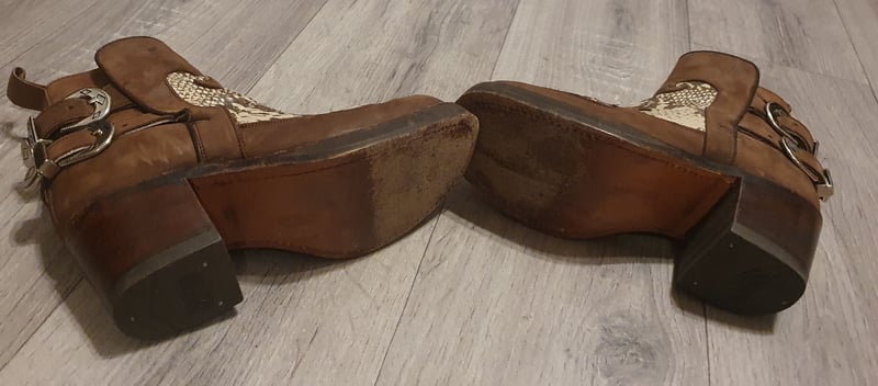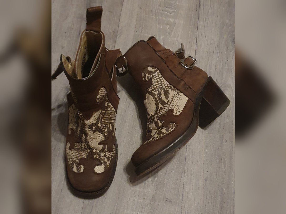 Sehr gut erhaltene Boots von Sancho Echtleder und Ledersohle Größe 35; passt aber auch bei 36 Braun mit raffinierten Schnallen Absatzhöhe 6cm