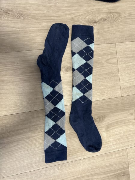 chöne Kinderreitsocken, die nicht so oft getragen wurden. Es steht leider keine Größe dabei, aber es sieht mir sehr nach Größe 30-34 aus. Die Socken sind im Hellblauen Bereich etwas fleckig, aber das fällt nicht wirklich auf. Gerne können sie auch mit einem anderen Artikel von mir verkauft werden. Die Socken würden vor dem Versand/der Abholung noch einmal gewaschen werden. Bei Rückfragen stehe ich Ihnen gerne zur Verfügung