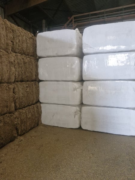 Häckselstroh in gepressten quaderballen in folie gewickelt, fasern bis 20 mm länge