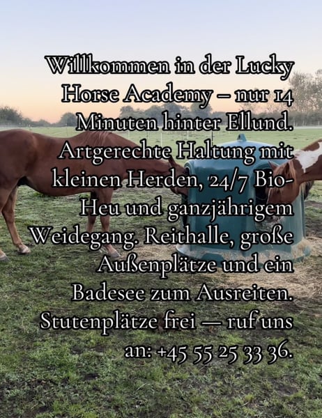 Nur knapp 13 Minuten verkehrsgünstig über die A7/E45 in Süd-Dänemark bieten wir mit unserem gewerblichen Pferde-Pensionsbetrieb deutschsprachigen Pferdebesitzern artgerechte und naturnahe Offenstallplätze in Herdenhaltung an. 20x60 Meter Reithalle mit Reiterstübchen Große Außenreitplätze mit Roundpen Stalltrakt mit Boxen für Notfälle Herdenhaltung mit Heu-Ad-Libitum Schönes waldreiches Ausreitgelände mit Badesee Tolle Stallgemeinschaft Maximal 15 Plätze davon sind zur Zeit 3 Plätze in unserer Stutenherde frei