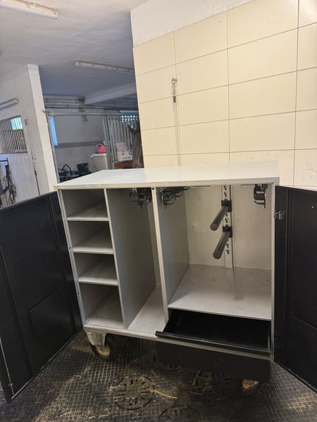 Verkaufe einen hochwertigen ALFAKO Maxi Prestige Turnierschrank in sehr gutem, gepflegtem Zustand. Der Schrank ist ideal für Turniere und bietet durch seine durchdachte Innenaufteilung viel Stauraum für Sattel, Trensen, Zubehör und Pflegeartikel. Ausstattung: • 2 feste Sattelhalter • Mehrere Trensenhalter • Regalfächer für Zubehör • Geräumige Schublade • Abschließbare Türen • Stabile, leichtlaufende Rollen • Seitliche Griffe zum einfachen Rangieren • Zusätzlicher Top-Schrank mit Frontöffnung • Inklusive passender Überzüge (auch für den oberen Schrank) Maße & Gewicht: Hauptschrank: • Höhe: 140,5 cm mit Rädern, 110,5 cm ohne Räder • Breite: 152,5 cm mit Griffen, 135,5 cm ohne Griffe • Tiefe: 63 cm • Gewicht: ca. 125 kg Top-Schrank: • Höhe: 35 cm • Breite: 135,5 cm • Tiefe: 63 cm Der Schrank ist sofort einsatzbereit und bietet optimalen Schutz für deine Ausrüstung – perfekt für Turnierreiter. Leichte Gebrauchsspuren (siehe Fotos), technisch einwandfrei. Besichtigung nach Absprache möglich Preis: 2100 VB Bei Interesse gerne melden!