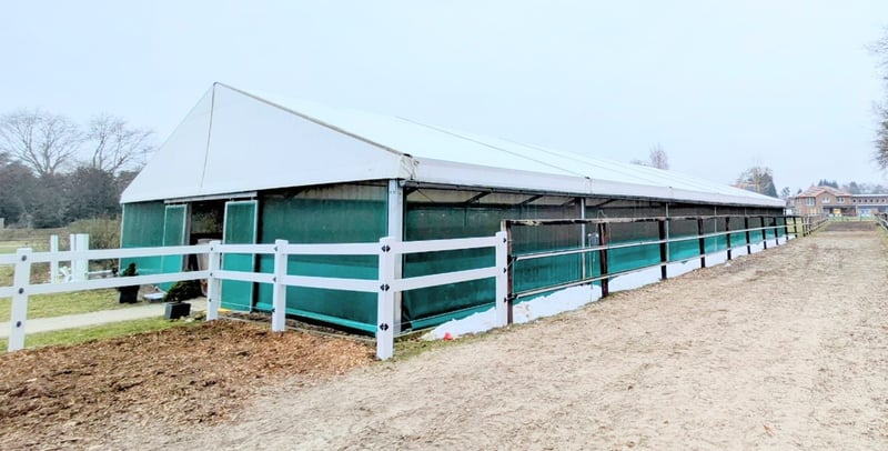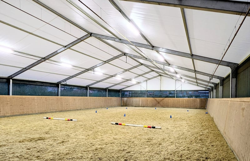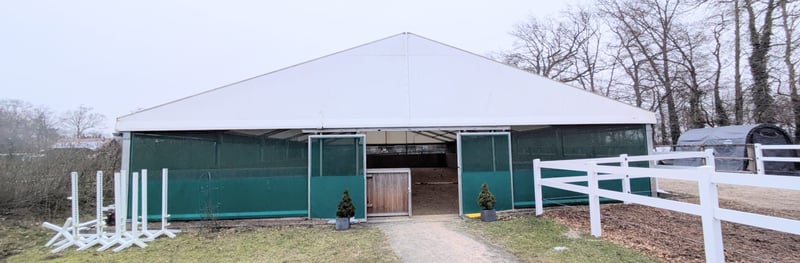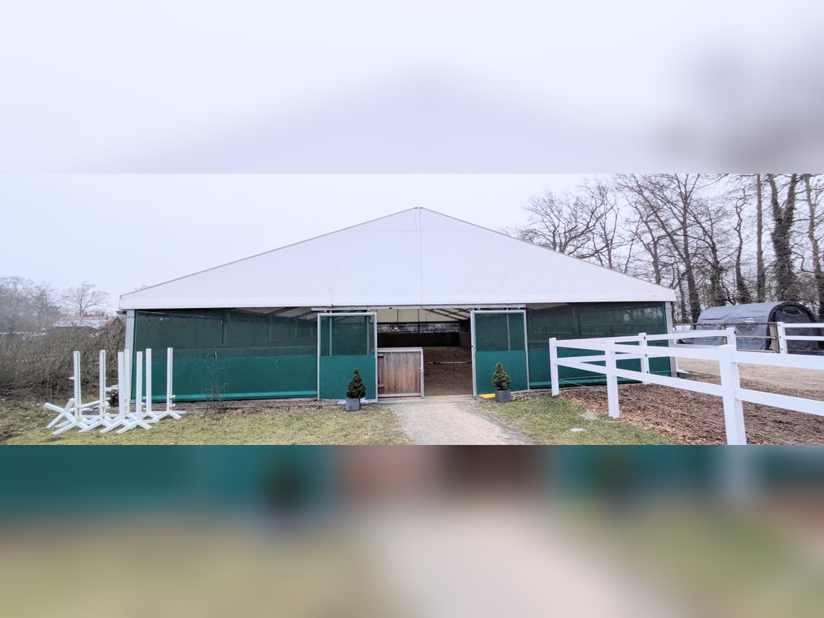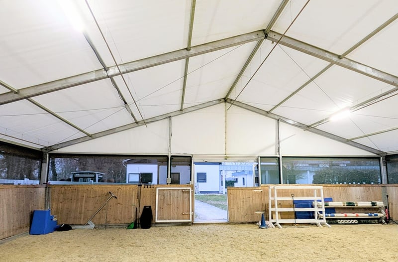 **Seltene Gelegenheit** Wir verkaufen unsere Zelthalle! Die Zeltkonstruktion selbst kann unterschiedlich eingesetzt werden, wir haben diese als temporäre Reithalle benutzt. Das Zelt hat die Masse 15 x 30 m, Hersteller: Spantec, Modell Favorit. Es wurde 2019 aufgestellt. Das Zelt ist in sehr gutem Zustand, das Dach ist aus PVC-beschichtetem Gewebe (650g/m2, UV-beständig, lichtdurchlässig & schwer entflammbar), die Seiten bestehen im unteren Teil aus PVC Plane und Windschutznetzen, die Träger sind aus Aluminium. Verankerung via Erdnägeln. Die vorhandenen 7 LED Lichtleisten geben wir im Preis inklusive mit. Aktuell ist eine Bowe-Beregnungsanlage für den darunter liegenden Reitplatz installiert, welche bei Bedarf mit gekauft werden kann (nicht inklusive im Preis). Besichtigung vor Ort selbstverständlich möglich.