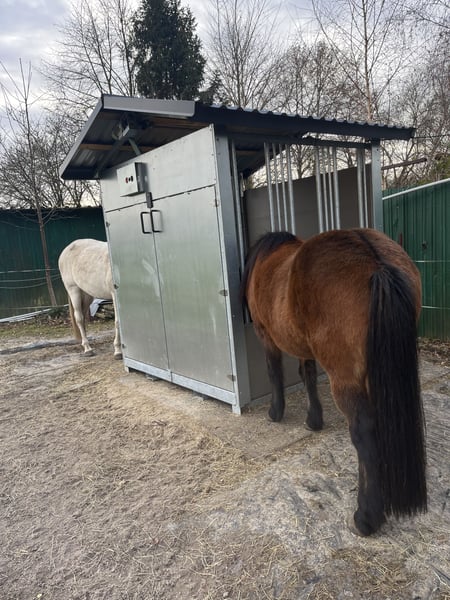 INNOVATIVE FUTTERMASCHINE aus Finnland: Zeitgesteuerte Heufütterungsmaschine für Pferde. Bis zu 12 Mal täglich können sich die Wände öffnen. Fütterungsdauer selbst bestimmbar. (Direkt am Gerät oder via Handy) Optionen: Model mit 6 oder mit 9 Fressplätze. Hochwertiges, finnisches Design. Der Heuraufen simuliert das natürliche Fressverhalten der Pferde, was für die Gesundheit von entscheidender Bedeutung ist. Angepasste, regelmäßige Fütterung beugt Koliken und Übergewicht vor! Spart ausserdem Unmengen an Zeit für die Eigentümer. Bringt Zufriedenheit bei den Pferden, da sie immer etwas im Magen haben. Geeignet für sowohl Ponys als auch Pferde. Sehr stabile Konstruktion. Einfaches Heubeladen durch eine Tür und ausreichend Platz für einen großen Rundballen. Notwendig ist einen Stromanschluss. Preise: 6 Fressplätze: € 5.800,= (zzgl. MwSt.) 9 Fressplätze: € 6.900,= (zzgl. MwSt.) Dachpaket: € 430,= (zzgl. MwSt.)