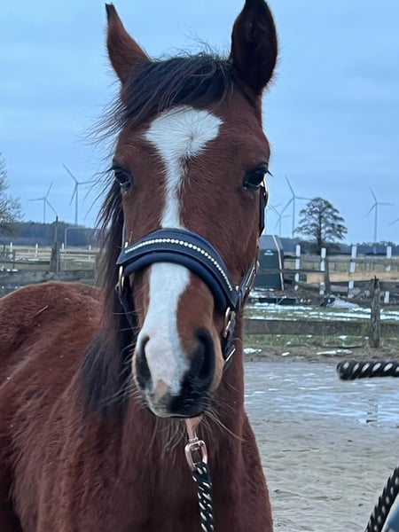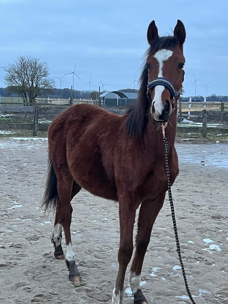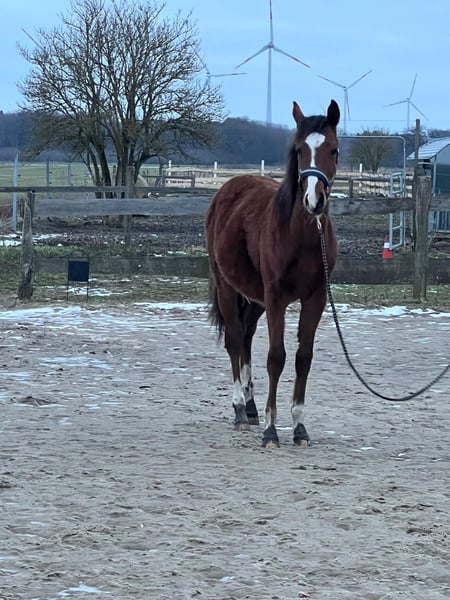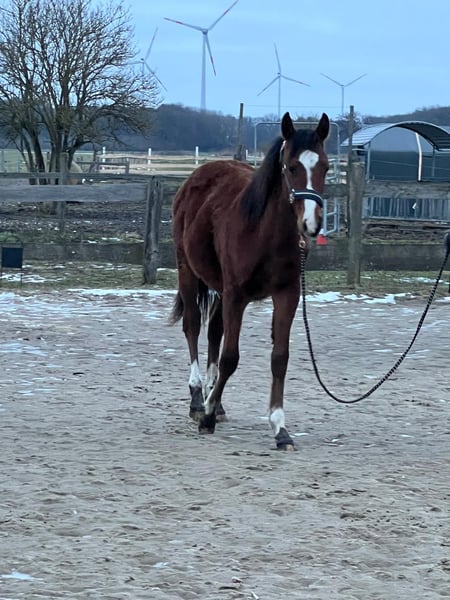 Nach langer Überlegung haben wir uns doch dazu entschieden unseren super hübschen ( Braun mit 4 weißen Füßen und toller Blesse ) und vielversprechenden Mighty Moonlight zu verkaufen . Geplant war ihn als Hengstanwärter zu behalten , da er schon jetzt von der Bewegung , als auch vom Exterieur wirklich vielversprechend und ansprechend ist . Da ich nun leider seit dem letzem Jahr gesundheitlich sehr eingeschränkt bin , kann ich mit ihm weder jetzt noch in Naher Zukunft so mit ihm altersgemäß arbeiten , wie es eigentlich mein Anspruch ist . Er geht brav am Halfter und ist ein wirklich lieber , junger Mann. Er wird im Mai 1 Jahr alt . Durch die Kombination seiner Vollblutmutter Manaia und seinem tollen Vater Mighty Pleasure wird er sicherlich in den verschiedensten sportlichen Riegen einsetzbar werden . Er bekam 2025 eine Fohlenprämie , da er sich sehr gut präsentieren konnte . Aktuelle Bilder folgen , die obigen sind meist vom letztem Jahr . Wer ein überzeugendes Nachwuchspferd für den Sport sucht , sollte sich unseren Minni Manni ( so nennen wir ihn ) unbedingt anschauen . Er ist als kleines deutsches Reitpferd bei dem Zfdp eingetragen . Seine Mutter ist 1.61 groß und sein Vater 1.55 . Somit kann er einiges an Reitern abdecken . Er hat natürlich volles Papier . Es ist kein Notverkauf und er soll auch nur in wirklich interessierte Hände . Keine Händler ! Er geht nur , wenn wirklich für mich alles paßt . Verhandlungen bitte nur vor Ort und auch nur im angemessenen Rahmen .