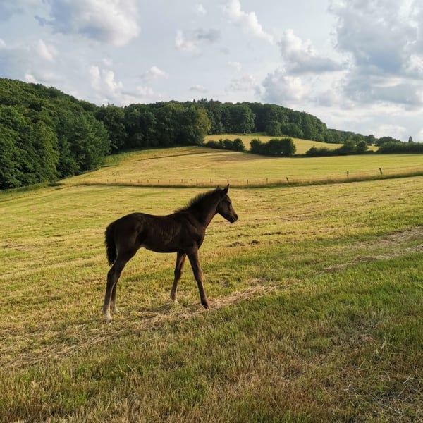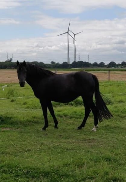 Zum Verkauf steht meine 12 jährige Rappstute. Sie war bisher ausschließlich in der Zucht eingesetzt, kennt es aber longiert zu werden mit Trense und Longiergurt. Sie ist gesund und kann nach ihrem Fohlen nächstes Jahr theoretisch auch als Reitpferd eingesetzt werden. Sie hat aktuell ein Stutfohlen bei Fuß von Der Zauberlehrling (letztes Bild) und ist von dem gleichen Hengst wieder tragend für April 2026. Sie lebt bei mir in Offenstallhaltung mit 24h Zugang zur Weide im Sommer. Sie hat kein Ekzem oder andere bekannte Krankheiten. War bei mir immer gesund und ist allgemein eine robuste Stute. Sie kennt es auch nachts in einer Box zu sein und tagsüber draußen. Ich wünsche mir für sie ein wertschätzendes Zuhause. Abgabe erfolgt, da ich ihre Tochter behalten möchte.