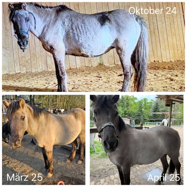 Wir haben Holly im Januar 2024 aus schlechter Haltung gekauft und sehr viel investiert, damit es ihr wieder gut geht. Leider können wir das aber nicht mehr auf Dauer gewährleisten, deshalb suchen wir einen geeigneten Platz für die kleine Maus. Sie hat Asthma, womit sie in Offenstallhaltung keine Probleme hat. Sie hat schlechte Zähne und braucht täglich Heucobs, da sie kein Heu und Gras mehr kauen kann. Wir haben die Zähne ganz am Anfang einmal gemacht und letzte Woche wieder wo ein Zahn gezogen wurde, evtl kann sie jetzt noch ein bisschen besser kauen. -UPDATE- Sie kann wieder problemlos Gras fressen. Sie ist Ekzemerin und muss regelmäßig geputzt werden. Hochwertige neue Ekzemerdecken besitzt sie und mit Decke und Fliegenmaske gehts. Ansonsten hat sie auch noch einiges an Zubehör, was alles mitgegeben wird. Reitbar ist sie aktuell nicht, sie lief immer nicht so gut und wir hatten Mal ne Ostepathin da, aber meiner Meinung nach ist es noch schlimmer geworden. Wir haben sie dann erstmal in Rente geschickt und damit ist sie sehr glücklich und hat auch keine Probleme. Ansonsten war sie immer sehr flott unterwegs und ist auch gerne gesprungen. Kutsche haben wir auch Mal ausprobiert, hat sie auch super mitgemacht. Ich denke, dass man das alles nochmal mit ihr machen könnte. Sie ist super lieb und sehr kommunikativ im Umgang, sie zeigt auch ganz deutlich wenn sie in Ruhe gelassen werden will und macht sonst ganz dicht. Ich glaube sie hat in ihrem Leben schon viel schlimmes durchgemachen müssen und braucht viel Liebe und Geduld. Ich würde mir wirklich wünschen, dass sich jemand findet der ihr noch ein paar schöne Jahre beschert und noch viel Spaß mit ihr hat. Bei Fragen meldet euch gerne. Platz vor Preis!