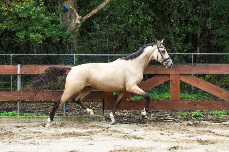 FEI PROSPECT / APPROVED STALLION! ⭐️ Heros is a 3,5 year old D-pony approved stallion / stud for breeding (and also sport), who measures 1.48m. With his beautiful buckskin color, he's a real eye-catcher! He has Zangersheide papers and his pedigree is: Hamlet x No Limit x Joost. His sire is the cremello stallion Hamlet, who is approved by the AES studbook. His dam's sire is the KWPN stallion No Limit, who jumped international at 1.60m level. No Limit has a jumping index of 150 with high reliability, placing him among the top performers. He is also known for his excellent offspring. No Limit is a offspring of the Preferent stallion Indoctro, who became the performance champion as a 3 years old. He also won the IAN Trophy in the 4 years old competition. At the age of 6, he competed in the World Championships for Young Show Jumpers in Lanaken, where he finished 6th. At 8 years old, he was already jumping at the 1.40/1.50m level, winning the Audi Cup and the stallion show jumping competition in Dortmund. Heros's dam line also includes the Holsteiner Preferent stallion Joost, who jumped at 1.50m. As you can see, Heros has a very beautiful and successful bloodline. https://www.horsetelex.nl/horses/pedigree/2630307/heros-by-esclinic-z Heros has incredibly good gaits! In the photos and video, we showed him jumping free for the very first time when he was only 2,5 years old (a year ago), jumping up to 1.20m straight away. He showed a very nice jump with a good back leg technique. We also saw that he really enjoyed jumping! Although he's an incredibly good jumper, we also expect that he will do good in dressage! He's a young, allround pony with plenty of potential. We have high expectations for him! Even though Heros is still young and a stallion, he's incredibly well-behaved and easy to handle! You wouldn't know he's still a stallion at all. He can also stay outside and on the stable next to the mares. He's very sociable with other horses. He knows how to groom/brush, lift legs, use a blanket, use a halter and of course, walk on a lead. We've also done some spook training with him. He'll easily walk past an umbrella, over a tarp, or even a wooden plank! We've now slowly started with making him saddle broken. He knows how to lunge with a bridle and saddle. He has been now under the saddle only a few times. He has also been on a strange arrea and has done his first jump under the saddle. He's doing it all good, but of course, he still has a lot to learn. He knew the trailer and little truck and is quietly on the road. He has no (stable) vices! He has clean X-RAYS for his neck, back, and legs without any remarks! He’s recently approved as an approved stallion by the EU-recognized RBP studbook. We already expect two foals from him next year and the mares where pregnant at the first time trying. A great opportunity for someone looking for a high quality, allround children's and sport/jumping pony or approved stallion for breeding. He's also interested for the international FEI competitions in the future. Of course, it's up to the new owners whether they leave him as a stallion or castrate him. € 11.500