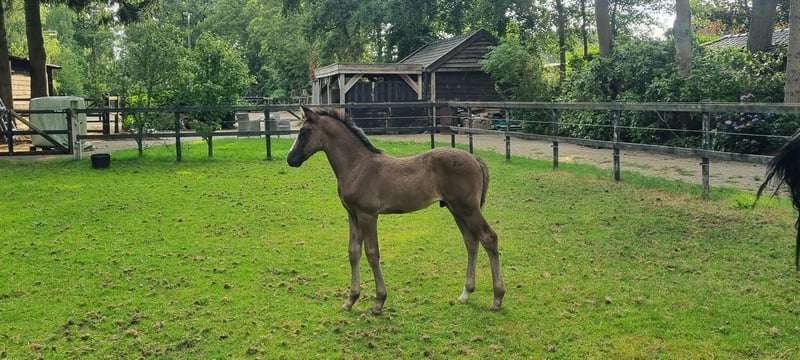 Zeer mooi zeer donkerbruin/ zwart hengstveulen met grand prix genen, moeder Just wimphof x Briljant x Havidof vader de bekende hengst One Million van Vivaldi x Apache die onlangs verkocht is naar Amerika. Allemaal mooie bloedlijnen die een prachtig hengstveulen hebben gemaakt. D-oc 104 en wffs negatief Wie gaat met deze knappe hengst een mooie toekomst tegemoet?
