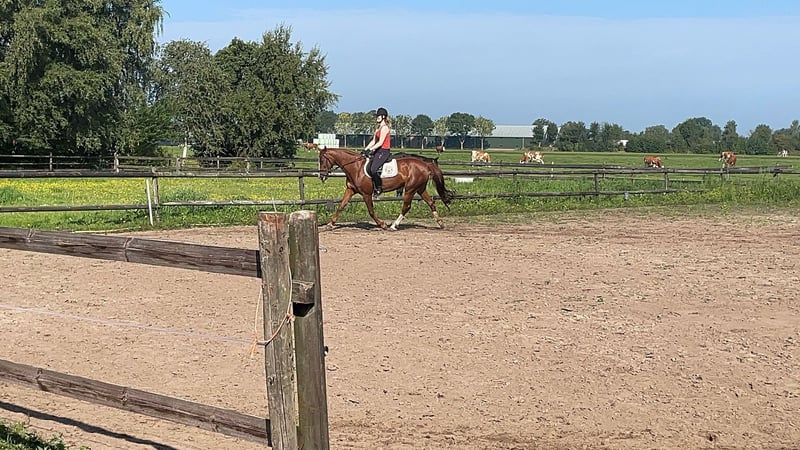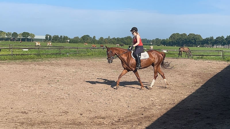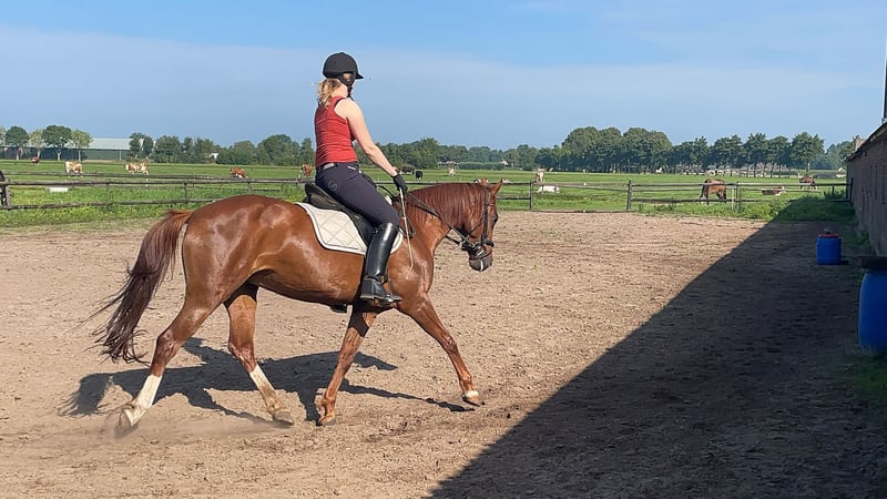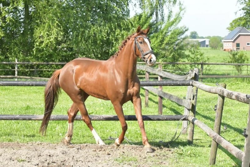 a beautiful appearance with an incredible amount of potential from both the sire and dam's side. But above all, a super sweet cuddle who is very tidy in the stable, easy to keep clean because there is always only one pile, and I never took out a dirty pony from the stable. Unfortunately, my health has deteriorated since the purchase, and I have never been able to ride her properly. She is only occasionally ridden by kind people from the neighborhood, but she deserves more time and attention. Whether she is ridden bitless, bareback, or with Western gear, it doesn't matter to her, and she handles everything well. Laces are tied in the saddle, phone calls are made... everything seems possible... She is a super sensitive mare during groundwork, but she also reflects how you are doing. When she gets lessons, you can see the sport blood come out, but with a loose rein, she walks gently with me, whether I’m disabled or with a 4-year-old. For safety, we only do this when stepping out. There is still very little training done, so I am selling her as a recreational horse because she is not yet ready for competitions. She needs some help with the canter. She is incredibly soft in the mouth. She can even be led by a 4-year-old while haltered, and she stands still even when a bucket of water is thrown over her. She is well-behaved with the farrier, veterinarian, etc. Daily, trucks and agricultural vehicles pass by the pasture, which she ignores. In short, a super sweet pony who deserves a nice owner. Still a very attractive price because she showed cribbing behavior when purchased 6 years ago. Now that she has been outside during the day for years and often in a herd, we only see it under stress when she has to stay in the stable, for example, during fireworks or when she has to eat pellets. We limit this very much, which is why we see a nice pony with a beautiful body. I hope the new owner has a lot of fun with her for a long time. I find the sale very difficult, so I would like to get this over with as soon as possible. If there is a good click, I will not hold her back; a quick transaction is preferred.