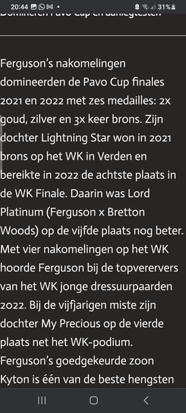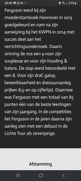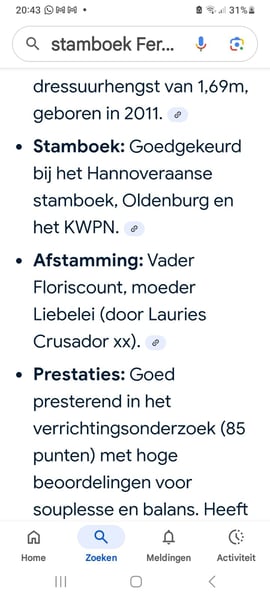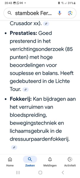 en prachtige verschijning met ontzettend veel potentieel erin van vader en moeders kant Maar boven alles super lieve knuffel die heel netjes op stal is, simpel schoon te houden omdat er altijd slechts 1 hoopje ligt en ik nooit een vieze pony uit de stal haalde Helaas is mijn gezondheid na aankoop steeds verder achteruit gegaan en ben ik nooit aan echt rijden toegekomen, en word ze maar af en toe door lieve mensen uit de buurt gereden maar ze verdient meer tijd en aandacht, of ze nu zonder bit of bareback zadel of met western uitrusting opstappen, gras of natte zand poel ,alles is haar hetzelfde en gaat goed , veters worden in het zadel gestrikt ,telefoon gesprekken gevoerd .. alles lijkt te kunnen... super gevoelige merrie bij grondwerk , maar ook spiegelend hoe het met je gaat. Wanneer ze les krijgt zie je het sportbloed boven komen maar aan een los teugeltje loopt ze met mij als gehandicapte of met 4 jarige ook lief rond, voor de veiligheid doen we dit vanzelfsprekend alleen als uitstappen, er is nog heel weinig getraind, dus ik verkoop haar hierdoor als recreatie want ze is nog niet wedstrijd klaar in het aanspringen heeft ze wat hulp nodig Ze is ontzettend zacht in haar mond Ze is in aan het halster /in de hand zelfs door een 4 jarige mee te nemen , en staat stil wanneer er zelfs een emmer water over haar heen gegooid word ,braaf bij hoefsmid dierenarts enz Dagelijks rijden vrachtwagens landbouw voertuigen enz langs de weide die ze dan negeert Kortom super lieve pony die een fijne eigenaar verdient Toch een zeer aantrekkelijke prijs omdat ze 6 jaar geleden bij aankoop lucht zuig gedrag liet zien Nu ze al jaren overdag buiten en ook vaak in een kudde komt,zien we het alleen bij stress op wanneer ze op stal moet blijven bv vuurwerk en brokken moet eten dit beperken we dus heel erg waardoor we een fijme pony met mooie body zien Ik hoop dat de nieuwe eigenaar heel erg lang plezier met haar heeft ik vind de verkoop erg moeilijk dus wil dit graag zo snel mogelijk achter de rug hebben, bij een fijne klik hou ik haar dus niet vast snelle afhandeling heeft de voorkeur