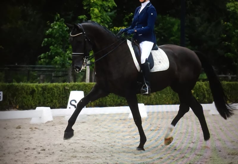 Schöne große dunkelbraune Stute zu verkaufen mit Stutfohlen. Mutter von Jazz x Don Primair (Elite, Sport, PROK). Sie läuft PSG, wird aber als Zuchtstute zusammen mit ihrem Fohlen von Santano verkauft, das vier weiße Füße und viel Qualität hat.