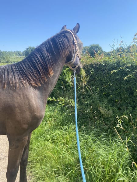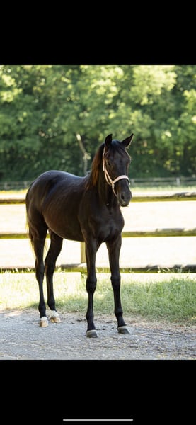 Udente AB is a mare born on June 6, 2024, with a wonderful temperament. She is a very sweet, jet-black mare with two white socks on her hind legs. She has a heart of gold and is eager to learn; unfortunately, I am unable to provide her with the training she deserves, so I am looking for someone who can give her that opportunity. Udente could also be a promising sport horse in the future, thanks to her pedigree, which includes several high-level dressage horses. Beyond that, she is simply a super sweet mare without any flaws. She is currently stabled with us from 8 a.m. to 6 p.m. outside, and at night she is in the stable with unlimited hay. She is expected to grow quite a bit and I estimate she will reach around 16.1 to 16.2 hands (approximately 1.75 to 1.80 meters). But beyond all that, she is just an incredibly loving horse.