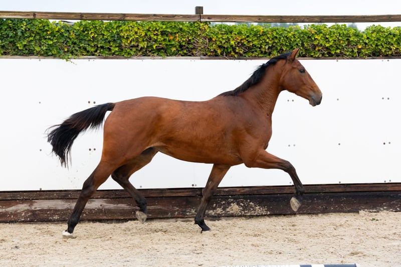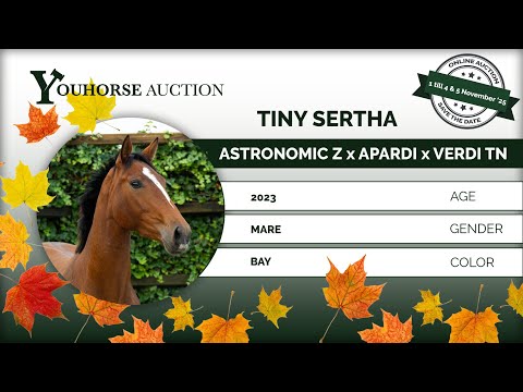 The two-year-old Tiny-Sertha stands out with her good, powerful canter and blood. She jumps the fences with ease. Sire Astronomic vh Legita Hof Z is eight and has already started internationally at 1.50m level with Angelique Rüsen and at 1.45m level with Christian Ahlmann. He is bred out of the 1.55m GP mare Naturelle vh Legitahof, half-sister to World Cup stallion Vagabond de la Pomme. Dam Osertha is a six-year-old daughter of the 1.60m Grand Prix stallion Apardi. Granddam Woodfield Cisertha (Verdi TN) is a KWPN elite mare who jumped international 1.40m courses.