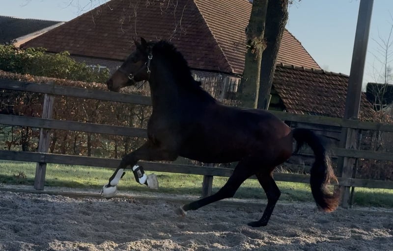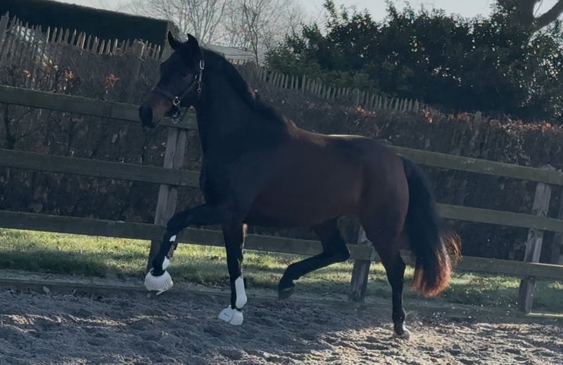 Talented young mare out of great damline with many PSG and Grand Prix dressage horses closely related. Gorgeous model with a striking appearance. Quality mover with superb hindleg and great technique. Diamond in the rough, comes straight from the group. Easy in hand. Used to walker, washing, cross ties, etc. X-rays 100% ok.