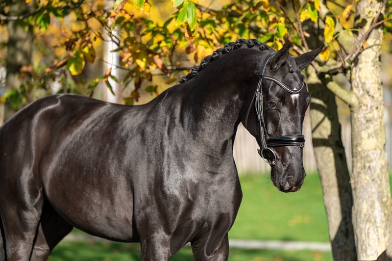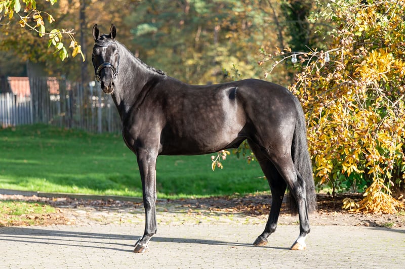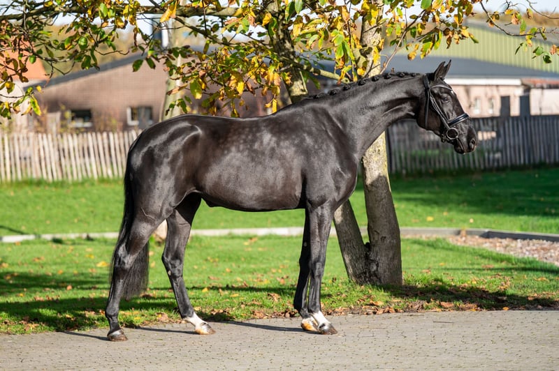 Sweety Noeska, piękna czarno-brązowa klacz rasy Blue Hors Santiano z matki po Fürst Romancier, wyróżniająca się wyjątkowym wyglądem. Sweety Noeska pochodzi z niezwykle silnej linii rodowodowej. Jej babka, Anne v. Tuschinski, wydała już dwa międzynarodowe konie Grand Prix: GGH IronMan v. Ferro i Escarigo v. Meastro, a także lekki tour, Incredible v. Apache. To czyni jej pochodzenie szczególnie interesującym zarówno dla sportu, jak i hodowli. Ojciec, Blue Hors Santiano (Sezuan x Romanov), jest znany ze swojej potężnej ruchowości, elegancji i ujeżdżalności. Wpływ Fürst Romancier po stronie matki dodatkowo wzmacnia ten profil, przekazując spokojne, pracowite i utalentowane konie do ujeżdżenia. Sweety Noeska jest negatywna pod względem WFFS i posiada dobrą wartość DO C, co czyni ją szczególnie odpowiednią do odpowiedzialnej hodowli. Wykazuje dużą równowagę, elastyczność i nowoczesny wygląd, z trzema poprawnymi podstawowymi chodami. Klacz z udowodnioną linią rodowodową, zdrową podstawą i wyjątkową jakością – gotowa do dalszej edukacji sportowej lub do poważnej hodowli. Sweety Noeska: genetyczne złoto z wyrazistością, zdrowiem i potencjałem.