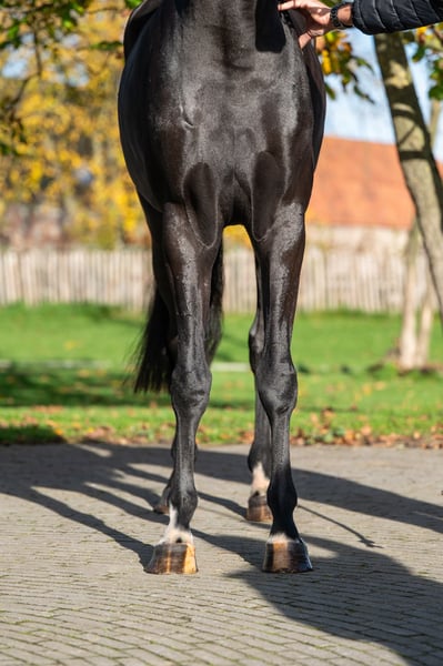 Sweety Noeska, una yegua mare de hermoso color negro-marrón, hija de Blue Hors Santiano y de una madre de Fürst Romancier. Sweety Noeska proviene de una línea materna excepcionalmente fuerte. Su abuela, Anne v. Tuschinski, ya produjo dos caballos de Gran Premio Internacional: GGH IronMan v. Ferro y Escarigo v. Meastro, además del caballo de Nivel Lige Tour, Incredible v. Apache. Esto hace que su linaje sea especialmente interesante tanto para la competición como para la cría. El padre, Blue Hors Santiano (Sezuan x Romanov), es conocido por su movimiento potente, elegancia y facilidad de manejo. La influencia de Fürst Romancier en la línea materna refuerza estas cualidades, aportando caballos de doma de carácter sobrio, trabajador y con talento. Sweety Noeska es negativa para WFFS y tiene un valor DO C adecuado, lo que la hace aún más apta para una cría responsable. Exhibe mucho equilibrio, flexibilidad y una apariencia moderna, con tres pasos básicos correctos. Una yegua con una línea materna comprobada, una base saludable y una calidad destacada, lista para continuar su entrenamiento para la competición o para contribuir en una cría seria. Sweety Noeska: un tesoro genético con presencia, salud y potencial.