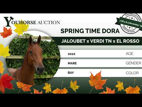 De driejarige Springtime Dora valt meteen op als ze begint te bewegen en springen. Ze toont zeer veel vermogen en heeft fijn bloed. Ze is zadelmak. Vader Jaloubet K debuteerde vorig jaar op tienjarige leeftijd in het internationaal 1.50m springen met The Jelcic (CRO). Hij is een halfbroer van de wereldbekerfinale winnaar in 2011, Taloubet Z (1.60m GP met Christian Ahlmann), Obadja (1.60m GP) en de hengst Big Star JR KZ (1.55m GP). Moeder Beaudora stamt af van Verdi TN x El Rosso x Zandigo.