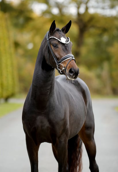 Bailarina compacta en elegante capa oscura y con una presentación impresionante. Ligerísima, con un gran movimiento y excelentes cualidades de temperamento, además de un carácter muy tranquilo, valiente y natural, con amplias posibilidades bajo una adecuada preparación. También cubre jinetes de mayor tamaño sin problema (rejinete en el video mide 1,79 m). Un diamante en bruto que puede ser desarrollado con cuidado, ideal para jinetes ambiciosos. Criada de forma sostenible y saludable. Se dispone de un buen informe de inspección para envío inmediato.