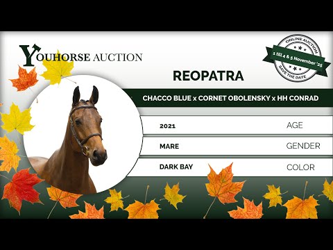 Reopatra, a four-year-old mare, has already competed in 1.00m courses. She is a refined blood-type mare with a light-footed canter and an elegant jumping style. Her sire is the renowned Chacco Blue, a former 1.60m Grand Prix horse with over 220 offspring competing at 1.60m level and above, including the 1.70m Grand Prix stallions Chadino, Chaqui Z, Chacco’s Son I, and Chaclot, as well as the 1.65m GP stallion Chacco Blue II. Her dam, Cleopatra de Kreisker Z, is well-bred as a daughter of Cornet Obolensky and the 1.55m Grand Prix mare Cerruti de Kreisker (ridden by Italy’s Filippo Bassan). Cerruti has produced two eight-year-olds competing internationally at 1.30m and 1.35m levels. Great-granddam Quindy de Kreisker (Diamant de Semilly), a full sister to two 1.55m GP horses, has produced no fewer than twelve offspring competing at 1.35–1.55m levels, including the approved stallions HH Einstein de Hus (1.55m GP) and Filou de Hus (1.50m). Quindy herself is a daughter of the 1.60m Grand Prix mare Jumpy de Kreisker. https://youhorse.auction/en/auction/Reopatra-CHACCO-BLUE-x-CORNET-OBOLENSKY
