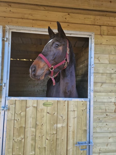 Elegante 3-4 jarige bruine merrie met 2 witte sokken vooraan. Sky is zadelmak, heeft mooie gangen en kan al goed afgebogen lopen. Sky is sociaal in de omgang en werkt graag.