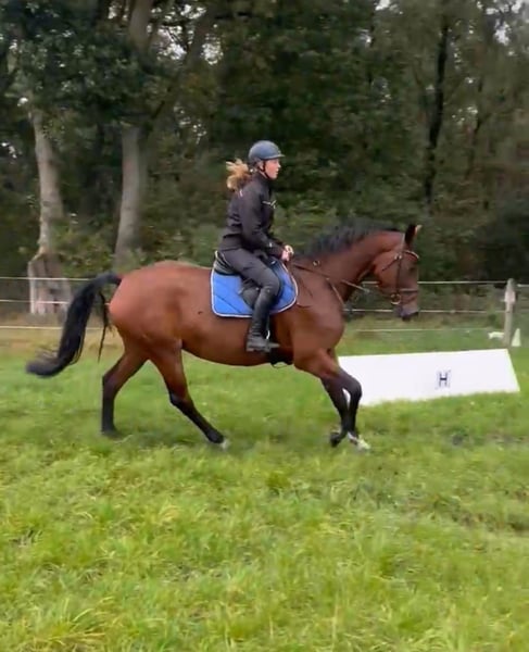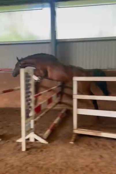 For sale is this 6-year-old KWPN mare "Ominka-Star". She is sired by Pommerol de Muze (Emerald van’t Ruytershof x Kannan) out of a dam by Zapatero VDL x Cantos. She is a very typy mare, standing at approximately 171 cm and has excellent coverage. Ominka had a foal last year and was only started under saddle this year. She moves well in all three basic gaits in the arena and is comfortable both alone and in a group in the field, having already made her first jumps under the rider. She is very easy to ride in contact and has plenty of energy. She is eager to learn and always strives to do everything right. In free jumping, she impresses with great bascule and quick reflexes. Ominka is an absolute gem to handle: her calm, relaxed, and affectionate nature makes her a perfect horse for amateurs! Of course, she is well-behaved for the farrier and loading, is barefoot, has had her teeth done, and has already been X-rayed. Currently, she is in a mixed herd in a paddock, but is also familiar with box stabling. She holds a middle rank within the herd. Now, she is looking for the right home where she can go through thick and thin with her new owner. Please only contact if you are seriously interested; due to the absence of the actual rider, a straightforward transaction is preferred. Trial rides can be arranged at any time, for which a fee of €30 will be charged to protect against riding tourism. For further information, please contact ONLY at 016095972290, no WhatsApp or messages!